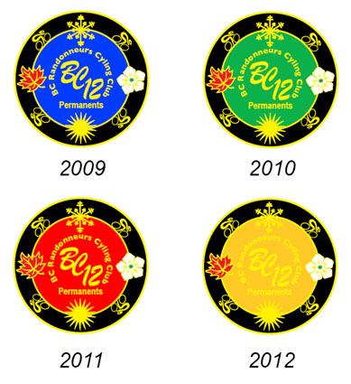 Club members who complete a continuous 12-month series of permanents (can include regular brevets) earn a "BC-12" pin. We've known this since the start of the permanents program in October 2008, but we didn't have the pin until now. Here it is.