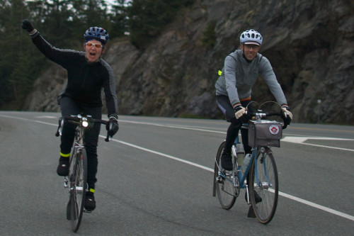 Before I left Vancouver friends advised me to "eat lots". Basically I ate anything and everything, until I was sick of eating all the time. The pizza at San Marcos in Campbell River was the best ever, and they let us bring our bikes into the lobby. Because of the days off, there was no real sleep deprivation. I got 2 hours of pretty solid sleep at Gold River plus 10 + 4 solid hours between the 400 and the 600 start. My preparation included permanents through the winter, hills, and one 500 km weekend. A big part of endurance cycling is mental toughness. I'm not that tough, but I can pace myself. When the going gets tough, I slow down (and sometimes cry). I have a few different positions which I can ride in comfortably for long periods and I tried to use them equally to spread out the contact points. I also have a favourite pair of shorts. There can be a lot of crap on the shoulders so a spare tire is a must. I had two punctures through my sidewall. I hate staring at the shoulder, weaving through rocks and potholes to avoid puncturing, but there was a fair amount of that on the #19A and #1. Traffic wasn't bad for the most part, but the