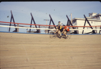 Photo 1: "The 1954 Empire Games Velodrome at China Creek was re-built and re-opened in June 1973. A ceremonial ride to open the velodrome had Tony Hoar stoking the late Lorne Atkinson's Claud Butler short wheel base tandem round the track. That was followed by several European pros putting on a show, the likes of which we don't see too often round here." Photo 2: "1983"