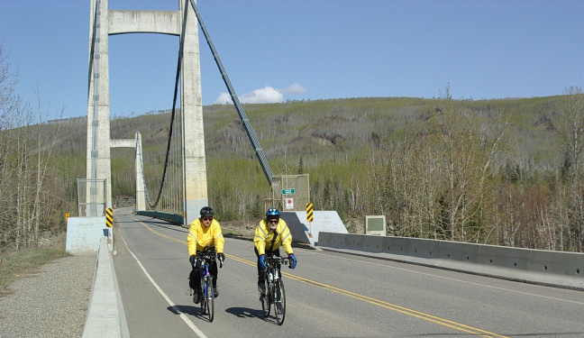 ![]() Eric Snucins & Wim Kok Photo: Bill Lindsay 2010 Peace 300 Km: A Wild Ride It had been cold, snowy in the weeks leading up to Peace 300. At 5 am, while sunny and calm, Erik and I left Fort St John with temperatures of 3 below zero. That was only the beginning. As we progressed we hit low lying pockets where the temperature must have been 6 below, because there was ice on pond and puddle. Spring was indeed very, very tentative with very few leaves on trees. Some aspen groves in protected areas did show the verdant green Alexander Mackenzie wrote about in his 1793 journal as he paddled up the Peace on his epic journey to the Pacific. I didn't keep a diary as we peddled on our epic wild ride along the Peace: le Petit Tour de Peace. But wild it was in the sense that we saw lots of wildlife. Somewhere in a tree an early warbler whistled the incomplete first line of 'O Canada'. Woodpeckers continuously hammered trees in search of choice breakfast bits. Down in the ponds geese were honking complaints about the chilly waters. The odd duck quacked in agreement. Deer were out in droves. On a few occasions we had to pull on the brakes to let them cross and to avoid a collision. In Hudson Hope the deer were so close to the road that we could touch them. Meanwhile a couple of moose were out as well. In one area an elk was sauntering among the deer, while in the distance a colossal black bear was digging for grub. We were cycling in a wildlife park. But was it every cold. At one point where we stopped, Erik noted ice chunks in his water bottle. The sweat in my headband had turned into ice crystals. Wow. At the Hudson Hope Control Bill Lindsay - member of our local cycling club and tour rider - welcomed us with some drinks and food. Much appreciated, Bill! He then scooted ahead to digitize our Peace Bridge crossing. We continued up the hill along Cameron Lake, down the hill along Moberly Lake. When we crossed the Moberly River and glanced across the Lake, the snowy peaks of the Rockies stood silently and starkly against the skyline. Beautiful. The Twin Peaks were particularly outstanding. Then up the long hill over the ridge and down into Chetwynd. Munch time, then onward and eastward. The generally prevailing SW wind did not materialize; instead it proved fickle, cold and contrarion. Just what we did not need on this almost 90 km eastward stretch. No ushering along this time. The stop at the Roadhouse Café control definitely left the wrong impression by serving cold turkey soup, because someone had unplugged the pot. Some service!! The final stretch was down and up, down and up, down and up on the roller coaster to the finish line. We did it, and in the process lowered the 2011 PBP preregistration date by two more weeks.
