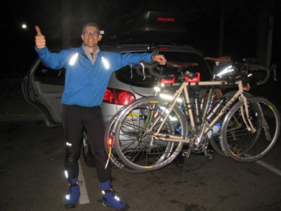 It was nice to be on the quieter sea side route. Qualicum greeted us with nice views of the ocean and mountains. I had stopped at the "Beach Hut" on a previous ride and was looking forward to chicken croquets on the return trip but they were all sold out...so it was with heavy heart I start off toward Union Bay. On the way Ken passed us, a full 45 kms ahead. We also saw the rest of the group heading back. As mentioned above, Union Bay was great and the food left me with a full tummy and light heart. We met Steve and his lovely mom and wife, who had come to 'support' his first 400 attempt. He took off before we were done eating...Philip had to get the home made eggs benny dish...great choice! We started back. I find the halfway point is mentally uplifting. Now the km's were counting down toward the finish. A head wind (how can you get a head wind both coming and going down the same road??) made the journey a bit hard in places and I always find the stretch from Buckely Bay to Qualicum Beach a long hard slog anyway. It seems to go on forever! Back in Qualicum, with no croquets to eat, we had an ice cream instead. We decided to push through to Nanaimo, where the thought of Delecado' bean and chicken wrap kept us motivated. We made a brief stop under the overpass entering 19 after Philip road over some glass. I picked it out of his tire, and new tube was inserted....we were off again. A layer of cloud was making the day look grey and the city of Nanaimo not very attractive. I do not like the section from 7-11 control to the highway in Nanaimo. Not a very bike friendly city! A fresh bottle of Blue Gatorade was in the camblebak. We got to Ladysmith and both needed a break at the park on the highway. A good stretch on the grass for a few minutes and we were ready for the long climb up to Chemanius. And then the rewarding long downhill past Mt Sicker Rd. In Duncan we fuelled up and met Steve again, just leaving for the last 50 k's. We had a nice rest and headed out into the closing darkness. The home stretch took us to Shawnigan Village, where fresh batteries make the IQ shine bright again. I was horrified at the amount of traffic on this most terrible section of road. From Shawnigan Village to the Malahat, pavement quality is appalling and no shoulders made for a few close calls between cars passing us and oncoming traffic (it turns out the Malahat was closed and traffic was being pushed through this way). It is a slog from the lake to the South Shawnigan turn off onto the Malahat. A steady climb and rough pavement, coupled with the stress of heavy traffic really wear you out. We were both feeling very sleepy as we descended the Malahat into Goldstream. I lead the way down. Once the lighted highway appeared by Millstream, we knew we were on the home stretch. Now to figure out the "follow the Bike Route" instructions on the route sheet. Turned out to be quite easy and interesting. Finally at 1225 am, after 21 hr and 25 mins we were done. A successful second 400 for us.