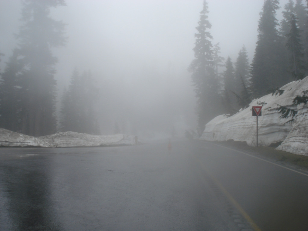 I was all ready to ride the Merritt Loop, but opted for the SIR 600 instead as a cost cutting and time cutting measure. Also, I started reading the email postings about the scarcity of rooms at the sleep control. It sounds like you ran into the same weather conditions that we did: nice on Saturday; not so nice on Sunday. After 3 hours of sleep, I rode out solo into a cold, rainy climb and descent of White Pass followed by a cold rainy climb and descent of Cayuse Pass. I'm attaching a pair of photos I took to give you an idea of the conditions: one on the climb of Stevens Pass and one at the summit of Cayuse Pass. See if you can guess which one was taken on Saturday and which one was taken on Sunday.