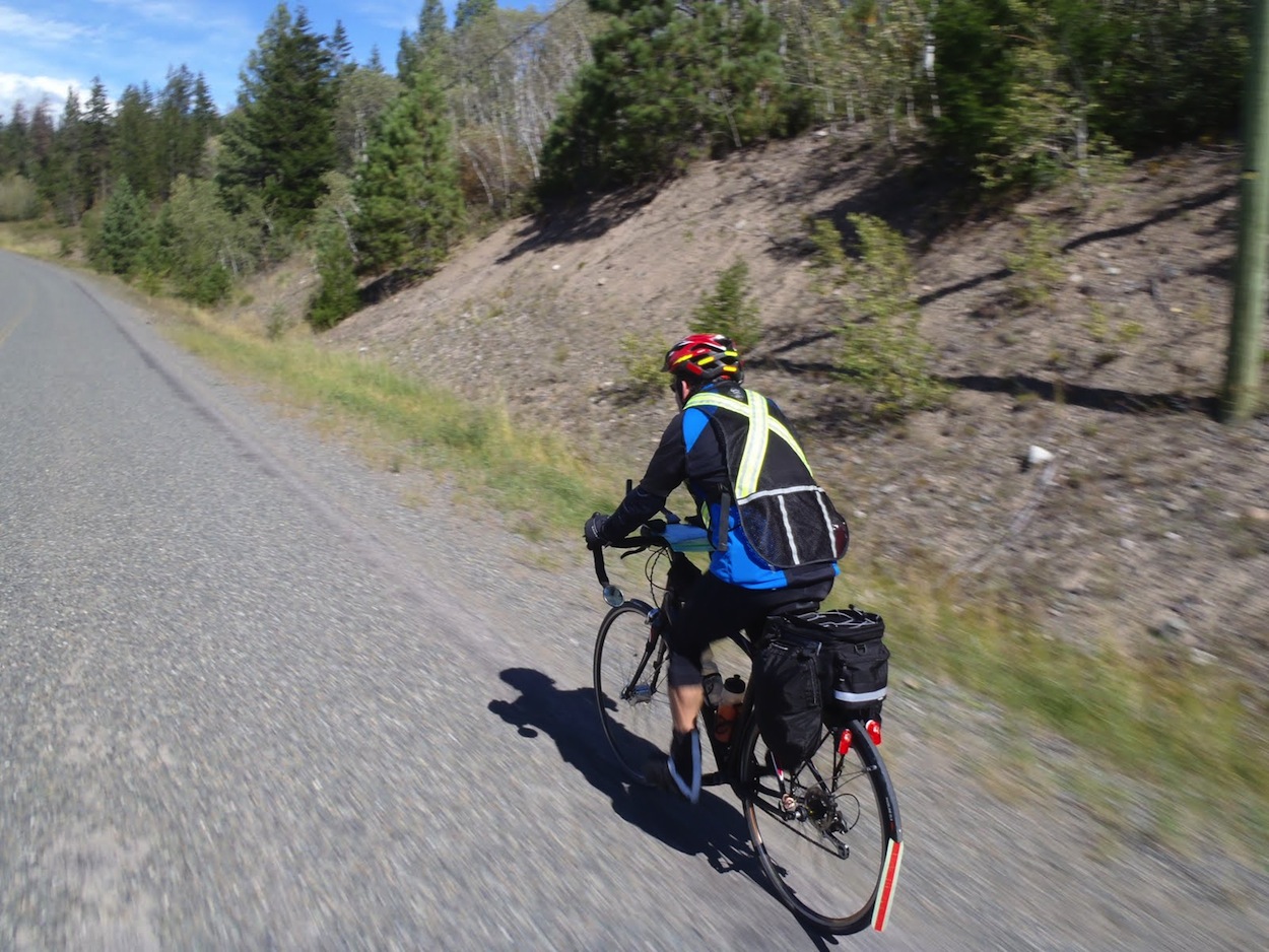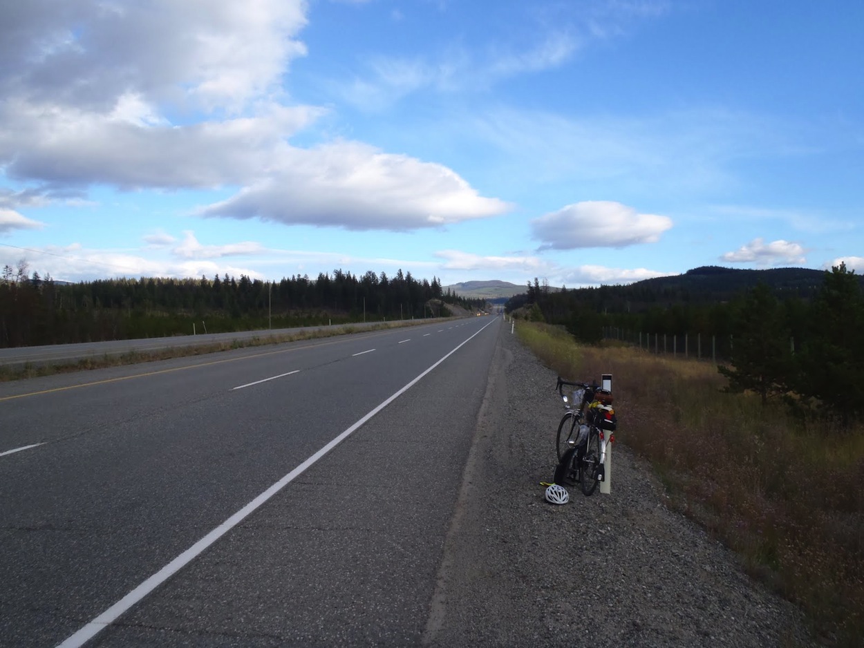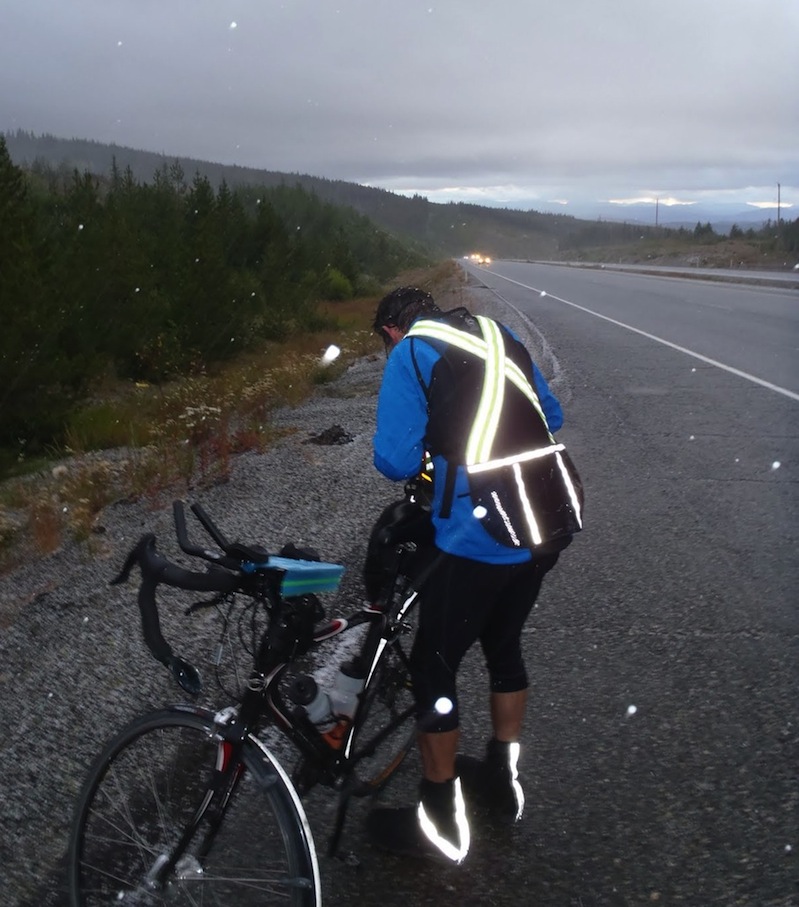 The second day was a long 380 km. I was tired from the mental strain of the day before and so when we stopped with Bob on the side of the road and Gary and Bob worked on a mechanical issue in the dark I laid down next to the guard rail and went to sleep for about 7 glorious minutes while the cars flew by in the dark. We continued on and a police officer pulled up beside Gary and asked if we were OK. Apparently numerous calls had gone in to 911 about a cyclist down. Gary explained what we were doing as we continued to ride beside the patrol car. The police officer thanked him, wished us well and complemented us on our awesome lights!