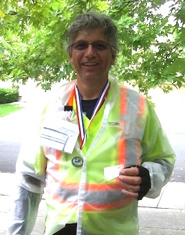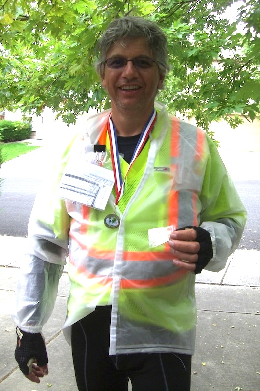 In the dark of the early morning Bill and I left with him navigating, I don't how he manages because he doesn't use a bike computer. Bill uses only the cue sheet but we managed to make our way by watching the clock and shining my headlamp on the street signs. It started to get very cold and rainy, Mark and Irene caught up with us just before sunrise, we were very cold and wet as we made our way to Keenesburg where we were able to take refuge in a wonderful café that had just opened. After a delicious sit-down breakfast and having procured plastic bags a large one to serve as a jacket for Irene and small ones to cover Mark's sandaled feet we set off to the penultimate control at Platteville. The last leg was a struggle for me but I made it in with the help of my randonnneuring friends, Mark was waiting to direct me in to the finish at John Lee's house. As Mark likes to say "We're here for a good time not a good time." True randonneuring spirit indeed!