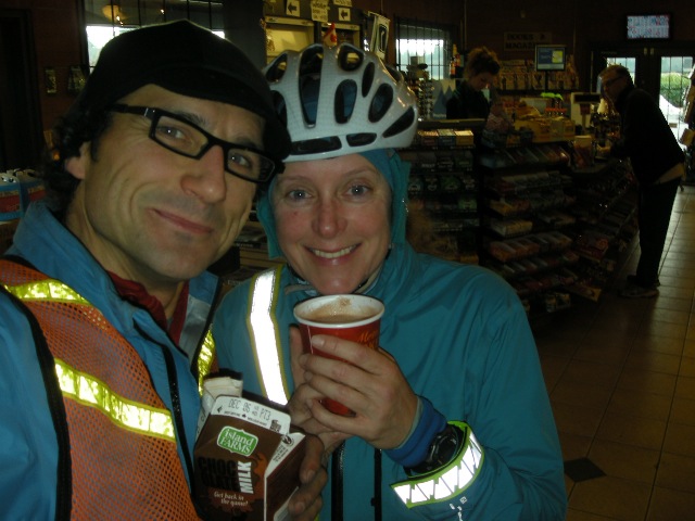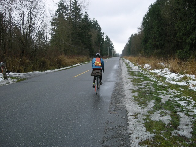 Hot Springs Pancake For a while, Karen had been talking about doing permanents to keep her fitness through the winter. I wasn't so sure myself, my running was keeping me plenty fit and this winter was forecasted to be a cold one. Well my motivation changed with the idea of finishing and staying at the Harrison Hot Springs resort. So that's how Karen and I found ourselves in the early morning of Sunday, November 28th in front of the Harrison hotel. The previous day had been icy most of the day, so we thought there was very little chance that we would ride at all today. But when my alarm went off at 6:00 in the morning, I crawled out of bed, put some clothes on and went to check the weather outside. Much to my surprise, there was no ice on the roads. I came back up to the bedroom to let Karen know that the ride was on, and was met with a less than enthusiastic response. But, we had packed the night before so it was a simple matter of putting on the gear, having a quick breakfast, loading the bikes and driving to the start. The roads were fine driving up there, so I guess we were going to have to go through with this. We were riding by 7:42. Less than a kilometer later we had to stop and secure Karen's generator cable that was hitting her spokes. At the end of Hot Springs Rd we stopped at the gas station for a pee break, total distance 6.5 km. We got over the awful Rosedale bridge without any problems, no ice and almost no traffic. Just before the Popkum store, we stopped for some photos of the snowy mountains and proof that we were doing this. A few km's later on Annis Rd, time for another pee break. In this cold weather, we weren't riding very fast and with all these stops I was beginning to worry about the clock. The forecast was calling for sunny skies today but the closer we got to Vedder Crossing, our home, the worse the skies were looking. It was going to be difficult to ride by and not stop. When we got to Bailey Rd, which is in the shadow of the mountains, the road had a thin coating of ice and slush on it. As you would guess this slowed us down even more. Once out of the mountain's shadow the roads improved, but the rain started. Slowly at first, but then by the time we got to Thomas Rd it was pouring. That's when I noticed I had no air in my back tire. We were beside a school at this point, so I walked my bike through the parking lot to get under the overhang at the front door. I couldn't find the cause of the flat , so I decided I would change the tire too. Well I couldn't even get the first bead on the rim, my hands were too weak from the cold. I had to put the old tire back on and hope for the best. When Karen saw that I had things under control she rode on slowly to get ahead and I would catch up to her eventually. But first, I needed a pee break. By the time I caught her, she had made the turn towards Yarrow, away from our home. We were still going through with this. Things were going well on the way to Yarrow, the rain had mostly stopped and we seemed to have a bit of tailwind. But as we got close our speed started to drop, and I was getting anxious again. And she needed a pee break. We stopped at the gas station and when Karen got off her bike, she touched her back tire. It was very soft, hence the slowing down. So she went inside to pee and I had a look at her tire. I had pumped it up this morning before starting, so something wasn't right. I tried pumping it again but the air was hissing out. I took the wheel off and found a big cut. OK, tire change attempt number two. It was a filthy job but this time the tire slid on relatively easily, if slowly. Meanwhile, Karen made use of this down time to also get some food. So, we shared canned pasta and a danish, all washed down with meal replacement. Yummy. Again, Karen went ahead while I finished eating and cleaning up. We definitely had a tailwind now, it wasn't powerful but we'd take it. As we got closer to the Birchwood Dairy, we both needed to pee badly. It made us ride faster. After our pee we went inside to get our cards signed and it felt so warm. Ice cream was out of the question, but we had hot chocolate and a pastry and some cookie samples. Anyway, we didn't linger and off we went. By the time we got to the Vye Rd hill our legs were warmed up and the climb wasn't too bad, and neither were the rollers that follow it. We saw our first cyclists, a paceline of three heading the other way, a woman doing the pull. Going down Townline and we need to pee again. Zero Ave starts off flat but gets into some pretty serious rollers as you approach 176th. And we could notice the elevation gain with the increase in snow still lingering on the roadside and the frozen water everywhere. We saw another cyclist on this stretch, but he was cooler than the weather as he didn't wave back at us. We were dreading the descent to the Douglas truck crossing, but the surface was fine if gritty. We pulled into the Campbell River Store and another pee break. Got our cards signed and snacked on hot chocolate and chips and pastry, all the healthy stuff. Good quick control and off we go back towards the start. We have to finish it all now.