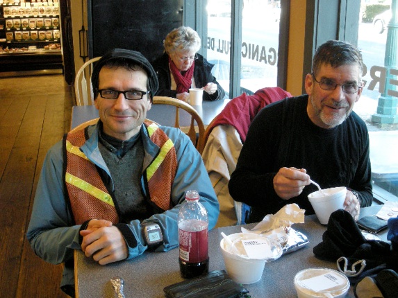 Some hot drinks and food stoked us up for what was to come, which turned out to be a delightful ride along O Ave., up 272nd. St., down 264th. to the Riverside Rd along the Fraser River. The descents down 264th were a bit scary ( ground frost and ice) although this didn't seem to slow Michel down. At Ft. Langley Michel and Karen headed for their new find, the deli at the IGA.