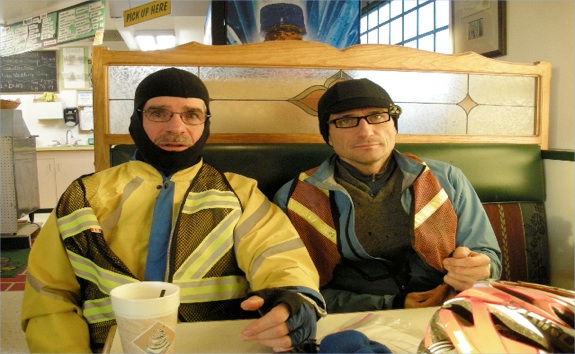 Chilly Permanent This permanent got off to an auspicious start with a flurry of invitations for one and all to join in. Numerous riders expressed an interest in doing so, but seasonal illnesses ( i.e. caused by viruses and lifestyle pursuits...<;) saw all but three, Karen, Michel and Gary B. still proclaiming a willingness to give it a go. The evening before the ride saw a burst of e-mails and telephone calls to confirm that the ride was on. The conversations went something like, "The weather looks iffy, but if you are still prepared to go so am I". The vocal tone of the conversations was not particularly convincing. To further complicate things Michel was sick and was not likely to do the ride. Karen and Gary were it. It was agreed we'd meet and start the ride at 7:30AM. I ( Gary) was up at 6AM and out the door at 6:45AM. The streets at Cultus Lake were sheets of ice and the car , parked across the street, was also covered in a layer of thick ice. This didn't look good. Getting to the car was life threatening ( my ice crampons would have been helpful to say the least). De-icing the car took what seemed for ever, and I arrived at Karen and Michel's later than planned. The good news was as I distanced myself from the lake the amount of ice and frost on the roads decreased significantly, although not completely, and Michel had decided to give the ride a try. The bad news was that I forgot my helmet ( duh), so back to the lake I went to get it. The 7:30AM start was now to be an 8AM start. The first leg of the route was to the Pointa Vista control. As we were following the Chilliwack River, guess what, lots of ice and frost on the road. The sun had not crested the local mountains, and we were in the shade..... translate it was COLD!!!!!!!!!!!!!!!!!!!!!!!!!!!!!! it would be nearly 20 km later that we'd break into the blazing sunlight out on the Sumas Prairie. Psychologically the sun felt great, but it did nothing to boost the temperature. When we got to Birchwood Dairy there were 6 very cold feet.