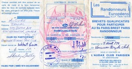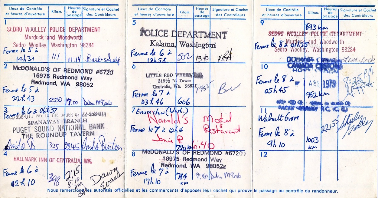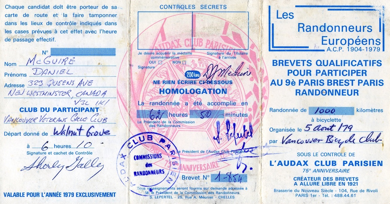 A Few Historical Artifacts Dan McGuire, one of the original BC Randonneurs from 1979, has passed along a treasury of historical artifacts, documents and photos from the early years. I've been slow to get to it, but I'm eager to share this stuff. Today I put a few things on the web sites. They're in logical places, but not necessarily pages that you would think to visit. Three are early control cards and one is the 1983 PBP route sheet. I've included a few images here, but encourage you to also follow the links where there is more thorough coverage and context.