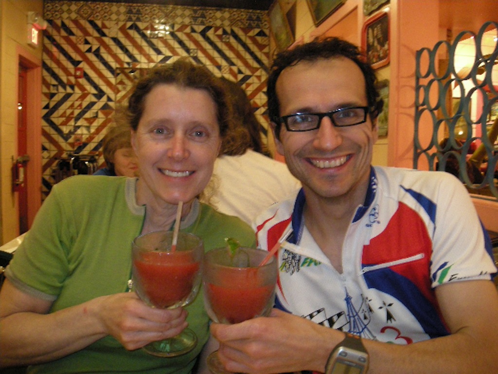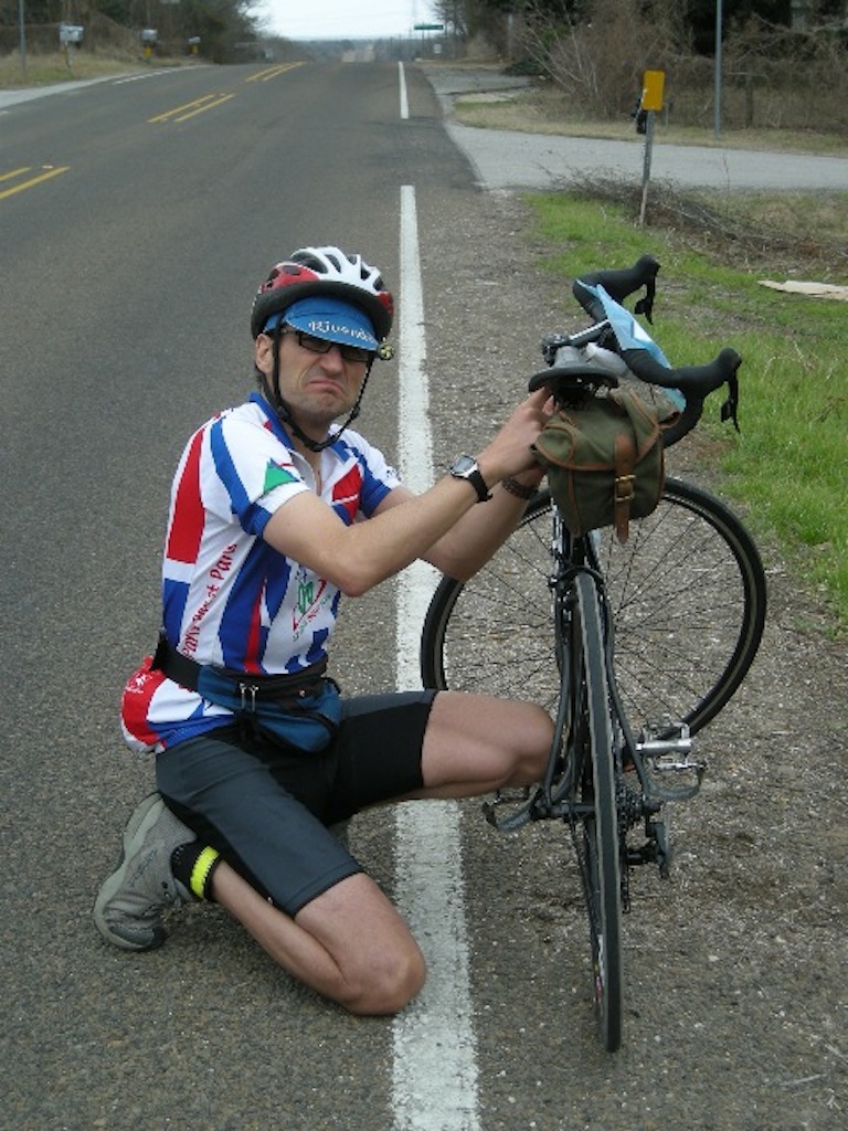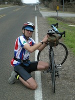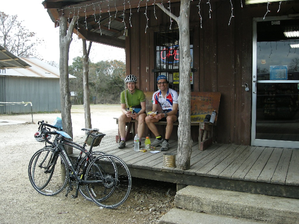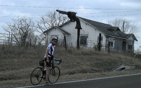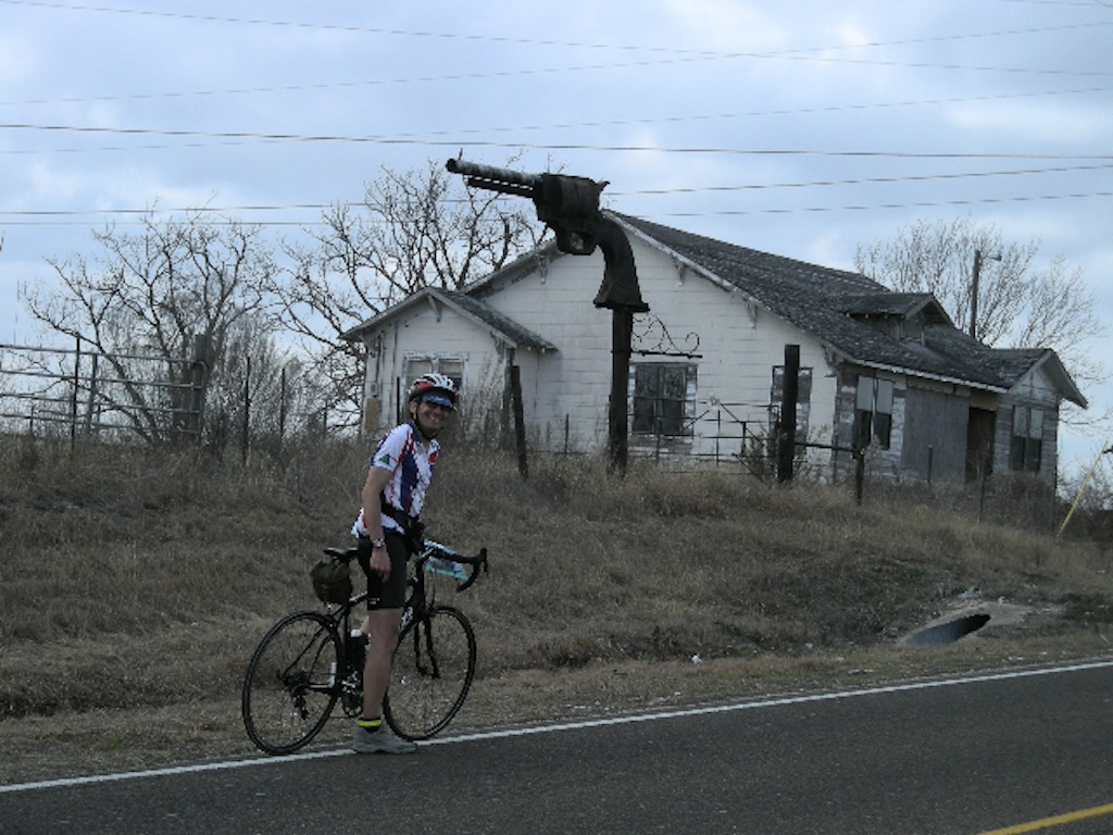 Texas Permanent Conditions: Mostly overcast with sunny breaks; high of 24 Celsius; lots of wind We were planning to visit Karen's brother in Austin after a trip to run the New Orleans (N.O.) Marathon and thought this would be a good opportunity to get our February permanent done in warmer weather. By chance, the Hill Country Randonneurs of Austin had a permanent called the San Marcos Stretch that came within 6 km of his house. We thought of bringing our own bikes down, but we instead found a shop that rented good road bikes for a reasonable price. We had all the arrangements made well ahead of time, we just had to hope for good weather. Well, I seriously pulled my hamstring while running on the track 3 weeks before our departure, so the N.O. Marathon was definitely out of the question, and I wasn't feeling too hopeful about a Permanent. Karen was also having a setback with her knee, so she was not confident either. On top of these doubts we were obsessively watching the weather on the web and were noticing with increasing dread that New Orleans and especially Austin were having colder temperatures than Chilliwack, consistently below freezing. Thankfully, by the time we got there the weather patterns had worked themselves out and we had temperatures in the 20's with little or no precipitation. After a fun visit to N.O., we got to Austin. We got picked up at the airport by Karen's brother, Don and headed straight to the bike shop. They put on our pedals and adjusted the seat heights and we were ready. As Don's car wouldn't fit our bikes, we had to ride to his house while he carried our luggage. Luckily, the route to his place was along established bike routes and went over some of the roads on the Permanent. Plus the 25km ride would give us a chance to get used to the bikes and make any necessary adjustments. The bikes were twitchier than our regular rides and the SRAM shifting wasn't what either of us were used to, but they sure were light. We modified the start location to be close to Don's house, but otherwise did the standard San Marcos Stretch Permanent. The route looks like a figure eight on the map and we were starting it between the two loops, doing the smaller northern section first. We left the house at ~ 6:50 under overcast skies and mild temperatures. We were wearing short sleeves and shorts, which made it slightly chilly for that time of day. We reached the start in about 15 minutes, and started right away. Our start location was in the suburbs and involved a lot of navigation and sharing the roads with morning commuter traffic. That slowed us down and made us ride cautiously, especially on unfamiliar bikes. A lot of riding also was on highways with wide shoulders, thankfully since the speed limit was 65 mph. We made a 50 km northern loop along rolling hills in Texas's Hill Country. This is an area dotted with homes that you see on Lifestyles of the Rich & Famous. Our turnaround was at Bee Caves and common sense told us to ignore the route sheet and turn around to come through the Austin suburbs again. By this time, five things were becoming dominant in our conversations. There's a lot of traffic around Austin. The roads are very coarse and 'buzzy'. Our saddles are very uncomfortable. It's very windy. And, our saddles are very uncomfortable! After crossing the outskirts of Austin we started our bigger southern loop. This led us onto quieter country roads which was a welcome change. The terrain was also flatter, which unfortunately also left us more exposed to the wind. We would be fighting this wind for most of the rest of the ride. The lasting visual impression I have of this southern loop is of big skies and views that went on for miles. Our Lytton Springs control was at a country store that looked abandoned, let alone open. But it was indeed open so we went in, and although tempted by the large jars of pickled pigs One of the most interesting occurrences on this ride happened when we stopped to photograph a large roadside revolver that we thought perfectly epitomized the Texan character. Well no sooner had we got rolling again, that from the accompanying house came running three big mean growling dogs straight at us. That stopped us in our tracks and as we were yelling out our loudest commands to try and get them to head back to their yard, the master finally opened up his front door. He also yelled at them for a while before they were reluctantly convinced to abandon their quarry. That made me appreciative of the fact that the owners of such dogs are usually unemployed and at home midweek and midday for just such incidents. On the approach to San Marcos, our third control we were on the worst road of the ride. We were on a sixty-five mph highway. And had to ride in the driving lane with heavy truck traffic, or Our fast transition time was wasted when we got lost leaving the San Marcos control. This wasn't our first navigational error and the lost time was really adding up. We fell victim to missing road signs or names changing or being different on the opposite side of the road. At least when we were finally back on route we had for the first time today, a tailwind. We might make it back after all. Things went smoothly right until the end of the route. Now we had to get back to the shop. We had forgotten the directions to get back to the bike store at the house and we didn't have the time to retrieve them. We thought that we might be able to remember the road names, but the combination of fatigue and failing light conspired against us. We were lost and the clock was ticking. So I did what no man ever does, I admitted defeat and asked for help. A young mother on her way to get dog food with a toddler in the back of her SUV offered us directions. We were off again but soon felt doubtful. She must have anticipated this, because just as we were to ask directions again she appeared out of nowhere to rescue us. She had driven ahead of us, parked her vehicle and was on the sidewa
