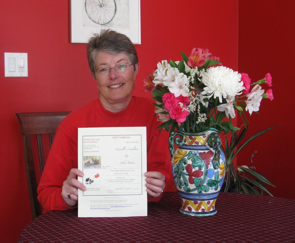 After another successful running of the Pacific Populaire Danelle Laidlaw was presented with a bouquet and a gift certificate for a weekend away by the BC Randonneurs Cycling Club. Many thanks to Danelle for contributing her organizational efforts and abilities to this event for the past 11 years.