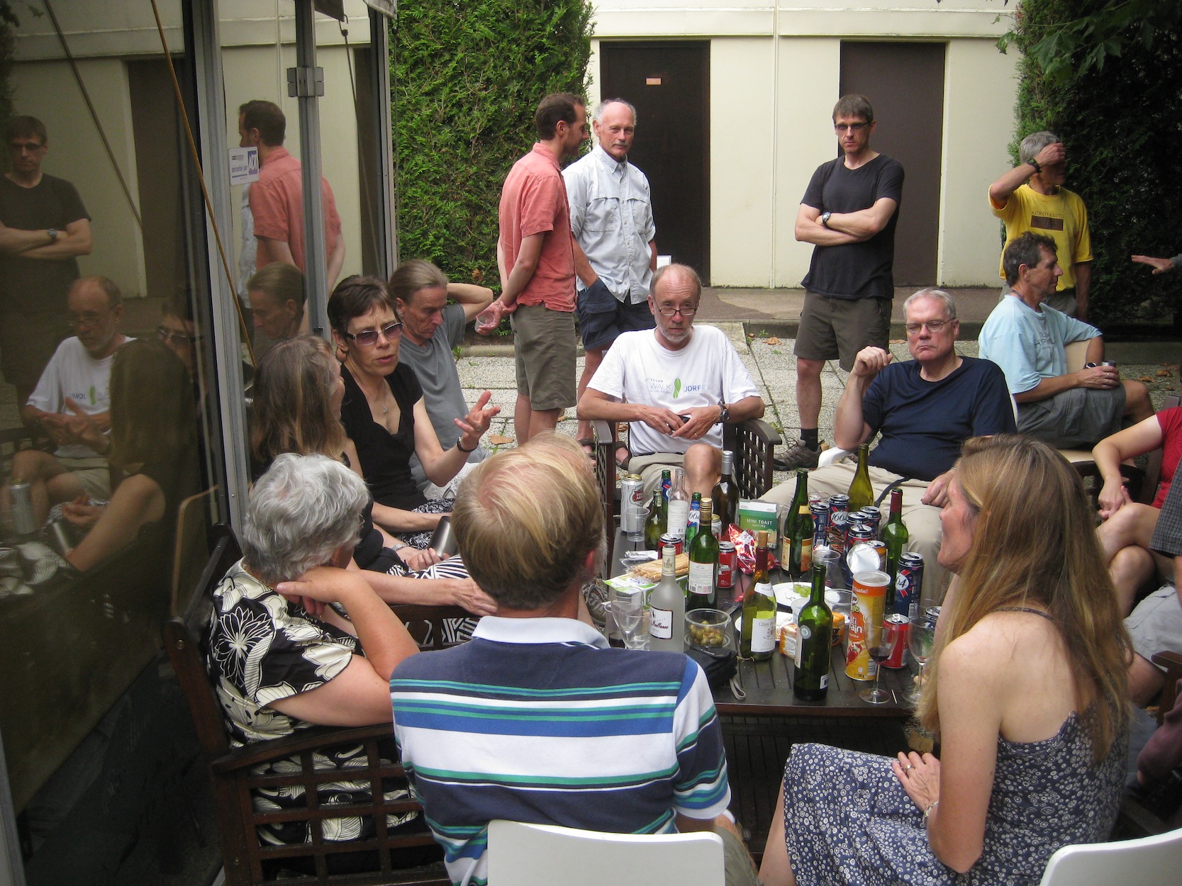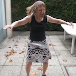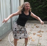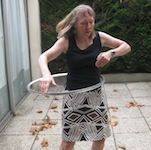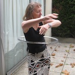 PBP 2011 - Deirdre Hula OK, here's the story. While in France Bob LePage (Deirdre Arscott's Bob) had a wheel failure - wrecked rim. Not wanting to waste the hub Bob removed the spokes. He did this at one of the regular late afternoon wine and cheese sessions at our hotel - example. People were wondering if anything useful could be done with the useless rim. That's when Deirdre picked it up and demonstrated that she's not just another ultra distance cyclist with six PBPs to her credit. (It soon became seven.) She has other talents: