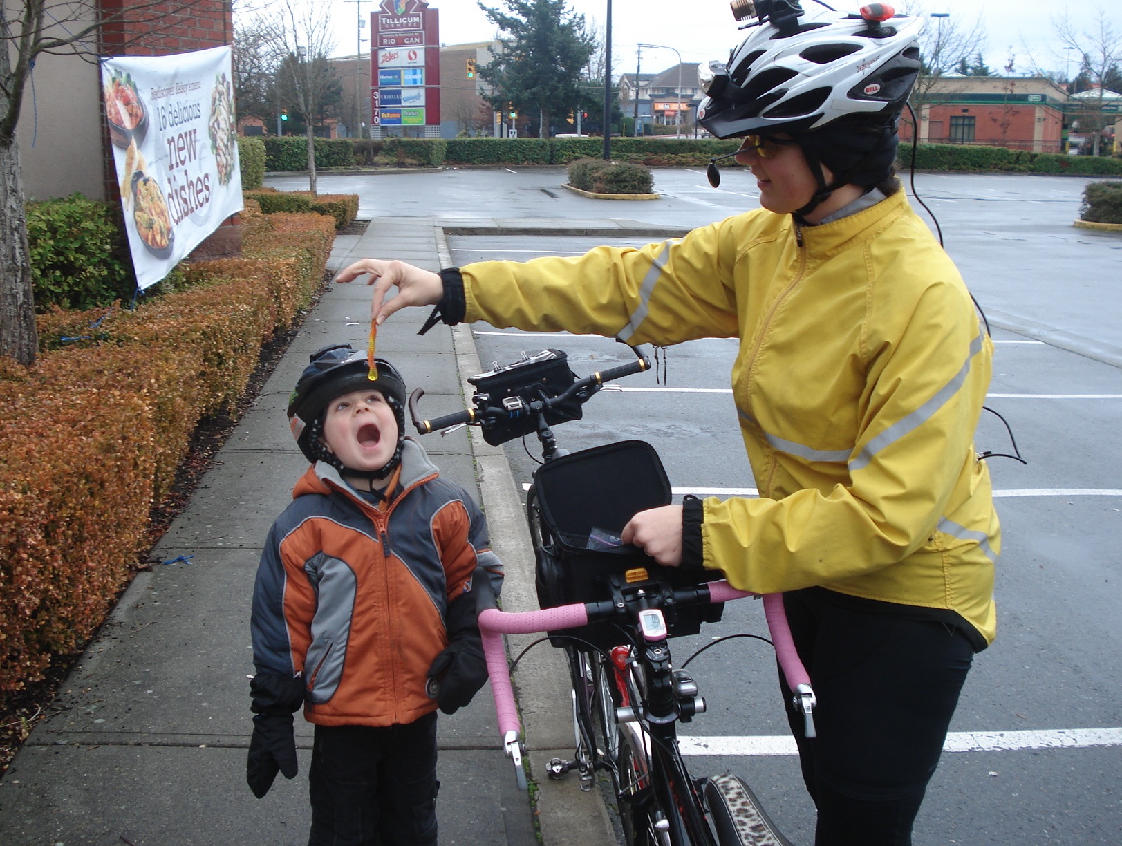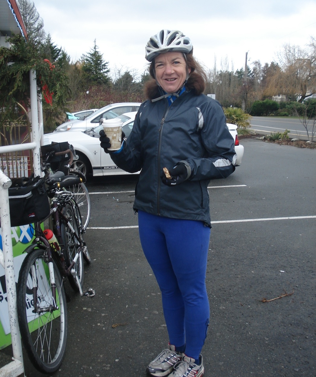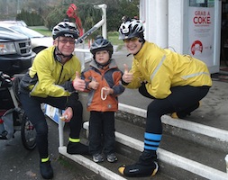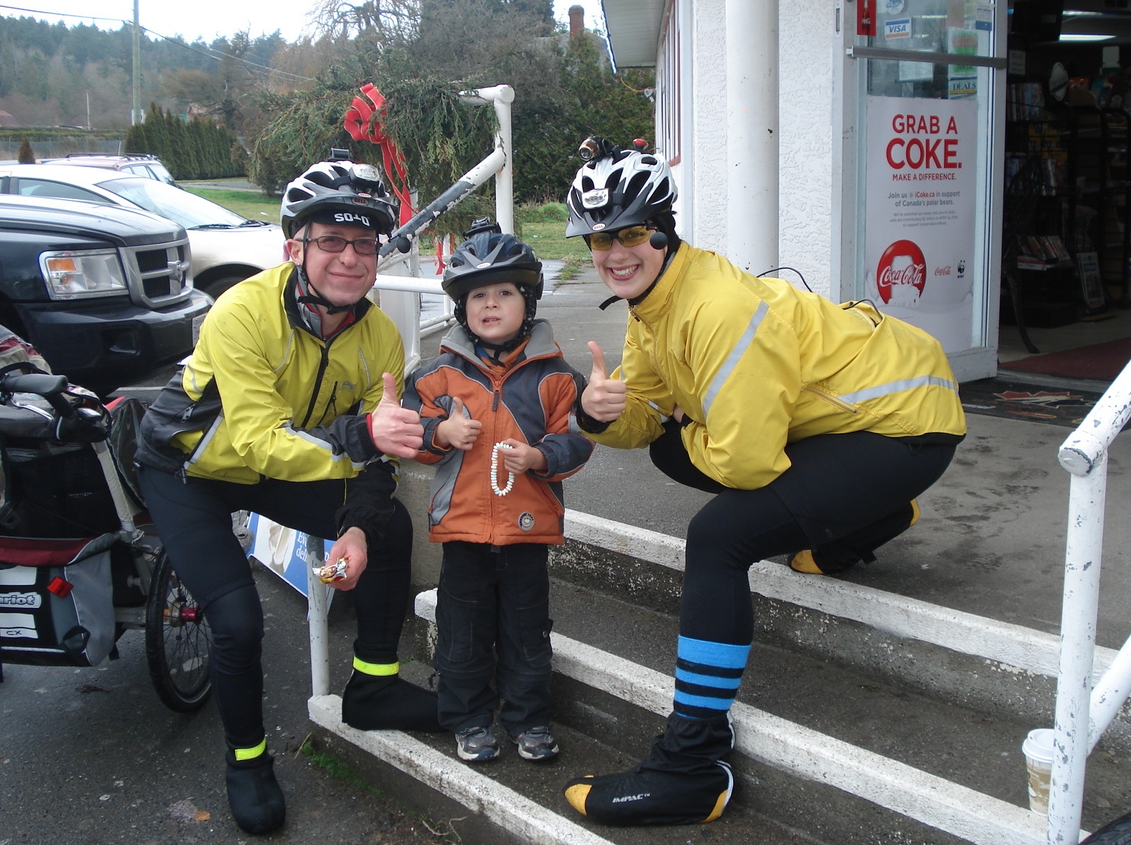 Wind: not much Riders: Steven Croy, Michael Croy, Brynne Croy and Lorraine Nygaard Report: In order to verify that the brand new route is viable three intrepid riders and one drag brake set out test it today. Reeling from turkey dinners and residual holiday illness it was assured to be a low-key ride, perfect for the task at hand. A better winter riding day could scarcely have been found (and indeed one had previously been vetoed for frost-related reasons). The forecast was favourable with winds and rain (supposedly) waiting until we were likely to be nestled into post-ride routines. All on the ride today had positive comments about the route, weather and company. We were all entertained by the running commentary coming from the Chariot trailer which housed young Steven who was "earning" his second consecutive New Year's pin. The route this year spends its time on the peninsula. From Kelsey's at Tillicum Mall you head straight out Interurban to Wallace (via W. Saanich) swing past the fair grounds on Stelly's X Rd. before wending your way to the luxurious new pavement on E. Saanich. A quick hop across the highway takes you to the well-known Lochside Regional Trail and dumps you on the patently ridiculous MacTavish interchange heading to MacTavish Rd. proper. A little climb takes you to the halfway point, a surprisingly well stocked and remarkably friendly convenience store. Turning towards the finish line you'll head up E. Saanich to the rarely seen Mt. Newton X Rd where you'll be treated to some unique vistas of pristine farmland (much of which is for sale). Heading for Keating X Rd, you'll take W. Saanich through Brentwood Bay, passing Butterfly Gardens. One more trip across the highway takes you to the Lochside Regional Trail again (other direction this time) connecting to the Galloping Goose briefly before peeling off to your final destination, Kelsey's. This route was designed to be fairly flat and straightforward. It is expected that weather and conditions will provide an extra nugget of challenge to those who wish to join us for the official ride in the new year. Wildlife: squirrels, swans, flickers, ravens, eagle, great blue heron, mallards (and assorted ducks), mini rams, ponies, horses, cows, pigs, chickens, geese and assorted flattened mammals.