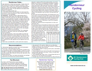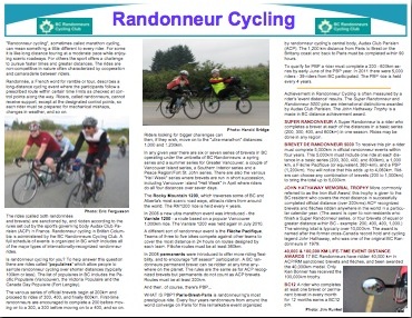 2012 Randonneur Publicity Brochure Interior brevets coordinator Bob Goodison persuaded Ryan Kurz to use his design skills to produce the first BC Randonneurs publicity brochure we've had since 2003. It's great, have a look. Click either image for the full sized printable PDF: [EF]