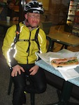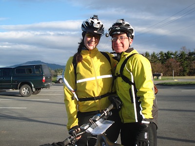 Chili Pre-ride by Mike Croy Here's a message Mike sent to me. It's also a pre-ride report for Sunday's Chili 200. Here's the route and info page. EF Hi Eric: Well, yesterday Brynne and I went out and tackled the chili 200 pre-ride, the ride was nothing short of interesting to say the least. We encountered every kind of weather except rain, which was very puzzling. As we set out the temp was a balmy -2 and roads were slightly frosty to down right icy. We experienced wild fluctuations in weather and temperature as the day progressed, at times it was 10 degrees and sunny then suddenly it was 3 degrees and lightly snowing. Heading back out to Sidney we encountered a full force hail storm like we have never ridden through before. The hail stones were so large they were ringing our bike bell and we thought it was another rider behind us trying to pass, but who would be crazy enough to be out in that kind of weather? As we rode through the accumulating slush and briskly exfoliating ice hunks flying at our faces all we could was laugh at the sheer absurdity of the situation. Hail turned to snow as we made it to Sidney, where we stopped briefly, choosing to head out to chase the sun we had spotted on the other side of the peninsula. We found some sun but it was not strong enough to dry or warm us sufficiently, we limped to the finish line cold, wet and tired. The mercury had dropped below zero once again, back to where it was at the start of the day but we managed to outrun the icing of the roads. We took our time on the ride, we spent a fair bit of time checking through all the cues. Overall I think it is safe to say we had a true randonneur experience and we finished off in the dark with satisfied smiles (or the agonized wince that passes for a finisher's smile on occasion) on our faces. Due to Victoria's strange street layout in Oak Bay and Gordon Head there are some navigational challenges to be had but the biggest hurdle for riders next week is sure to be the weather. The nature of the route means that a sustained prevailing wind will work sorely against and with you at different times, this can be devastating if you have miscalculated food or energy stores. We have some work to do later tonight cleaning up the cue sheet, we found many slight errors that will need re-working. Here are some pictures we took as the day progressed. The random parking lot shot is of snow at the last control in Sidney and it does it very little justice. Brynne wanted to memorialize the hail but was torn between "capturing the moment" and "prolonging our misery", we soldiered on. Cheers Mike and Brynne