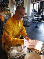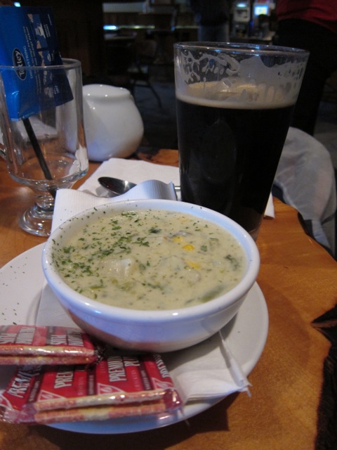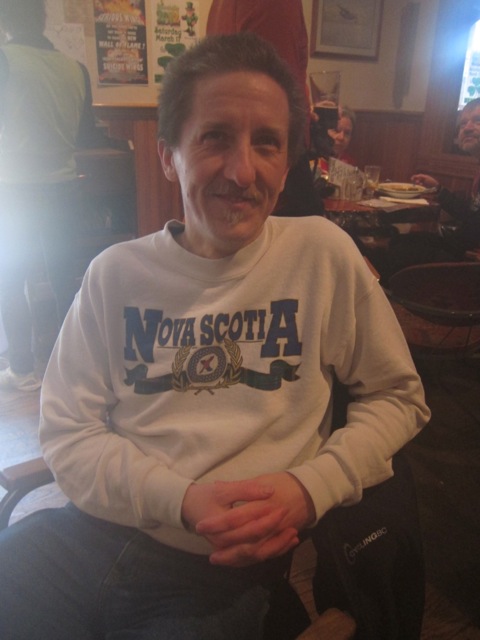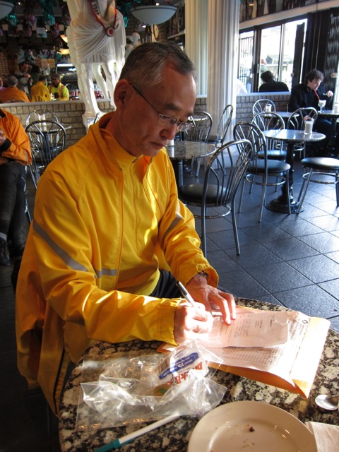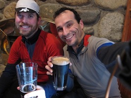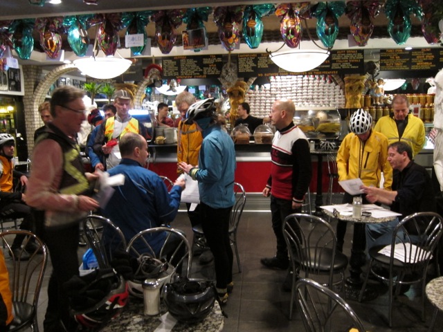 When we got to the Sasquatch Inn, Alex was waiting for us, and Susan was fixing a flat. We went inside and were warmly welcomed by the staff, as many other randonneurs were warming up with hot food and drinks. Meanwhile, Jeff was celebrating St Patrick's day with a Guinness. Seemed like a good idea to me, so I got one too. All filled up we turned around and headed back to Vancouver.
