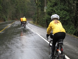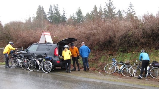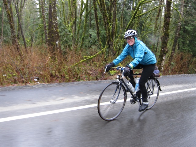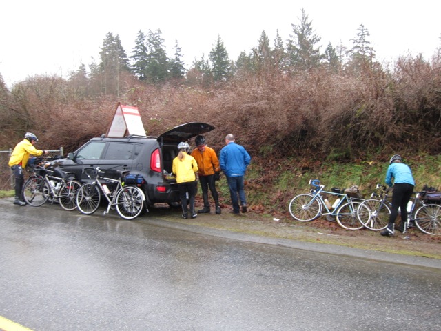 The ride started overcast but pleasant as we headed west on Broadway and the Lougheed. But half an hour in we started getting sprinkles that eventually became steady rain. Karen and I hadn't ridden our bikes for several years along Lougheed, so this was bringing back lots of memories. Sharing the road with heavy traffic, rain pouring down on us ... good times. The turn onto Hayward was a welcome break from the heavy Lougheed traffic and the climbing would warm us up. It was great to see Tracy at the secret control with a trunk full of goodies. Karen and I especially enjoyed the ginger molasses cookies. After this stop, the climb up Keystone was was especially beautiful and peaceful and in spite of the 1C temp had us nicely warmed up, for the rest of the journey.