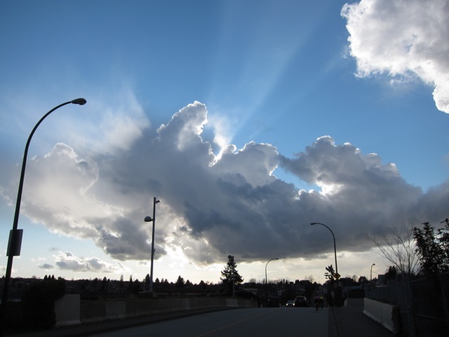 Along with the heavy rain we had to battle the winds on the return leg and as usual the worst stretch was Nicomen Island. It eventually stopped raining on the way back and it looked like it would be dry all the way in but Laura Penner jinxed us by mentioning it out loud. So of course it started raining again on us on Barnet Hwy. We were on a high on the Adanac bike route as the finish was in sight and were rewarded by an amazing sky.