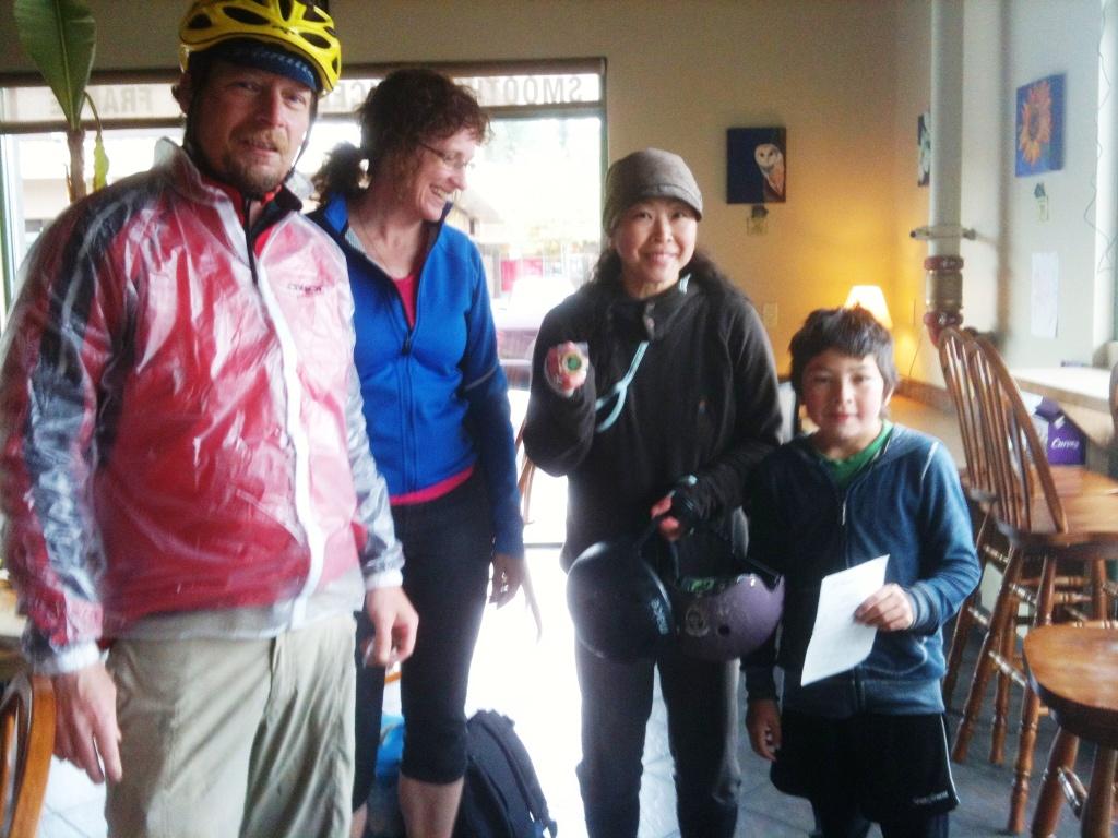 Nanaimo Populaire Report In Nanaimo, Saturday dawned bright and sunny although the temperatures were a little on the cool side. Cathy and I arrived at the Serious Coffee to set up the Start / Finish control at about the same time as the first riders. We quickly got set up and started registration. We saw some new faces, some familiar faces and some 'historical' faces (former randonneurs who have not been in the club for a few years). We even had a 'rando family' as John, Norie and Tai McGillvray made the trek from Denman Island with a few of their friends. This year we used Stephen Hinde's well established route from south Nanaimo to Lantzville, back to south Nanaimo, further south to Cedar and Yellow Point before returning to south Nanaimo. Since this route is essentially a figure 8 the Serious Coffee cafe functioned as the start, the 50 km finish, a mid-point control for the 100 km route and the finish for the 100 km route! There was a lot os coming and going! We also had Kristy Mighton staff a Secret Control in Lantzville and Martin Williams set up a second Secret Control on Yellow Point Road. We managed to get the five 50 km and the fifteen 100 km riders away at about 10:05 under sunny skies. Roughly 25 minutes later clouds moved in, the sky darkened and the rain began pelting down! Cathy and I just looked at each other - so much for the fine weather! The weather was to have a profound impact on the rest of the ride. The first DNF phoned in soon after the first downpour, as the rider was too wet and cold to continue. A couple of showers later, two more DNFs called in with similar concerns. Soon enough, a steady stream of riders began arriving back at the control looking somewhat soggy but cheerful nevertheless. For the 50 km riders, this was the end of their ride and most of them looked fairly relieved at the prospect. Eventually the McGillvray clan arrived; all looked pretty done. However, a mug of hot chocolate and a finisher's pin soon revived 9 year old Tai. How his little legs powered his mountain bike with its fat tires up all those hills is beyond me, but his smile said it all. Definitely the highlight of my day was handing Tai his pin.