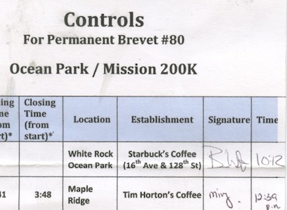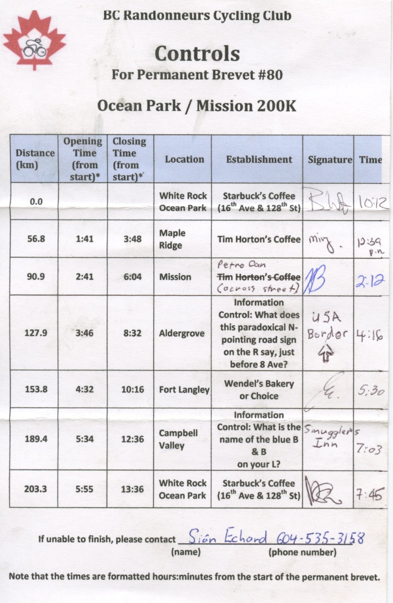 My Brain Walton Permanent I was in a bit of a hurry to get out of the Ocean Park Starbucks. It was after 10 a.m. already and I wanted to be back for a big family dinner. There was line up at the till inside so I asked a group of three guys who were sitting and sipping in the courtyard if one of them could be my witness for a bike tour that started here. One guy grabbed the card - his friend said "you know it's ironic that you would ask him to be your witness. He's an olympic silver medallist." I asked the guy signing my card which sport. He said track... points race. I guess my brain wasn't working right. I thought he meant track and field. I said wow, thanks, glad to meet you, and was on my way. I few clicks down the road it dawned on me that he was referring to track cycling. That's what his friend found ironic. Then the penny dropped - it was Brian Walton. I pulled over and checked the signature on the card... sure enough. I remember watching Walton's career fairly closely in the 1990s when he was on the Motorola team. I think he may have been only the third Canadian in the European peloton I would have liked to chat a bit, or at least acknowledge I knew who he was. It's actually the second celebrity moment I've muffed in recent years. At a reception for medievalists I talked briefly with Terry Jones (Monty Python) and had no idea who I was talking to until clued in afterwards by my wife Siân. Nigel Aspinall's permanent #80 is and enjoyable varied route taking in the Dewdney Trunk / Stave Lake Dam road and a nice selection roads criss-crossing the Valley. Maybe there's a detour that could avoid the short truck-heavy section of Brunette in New West. The road through Matsqui Village is shut down completely at the moment, and there's a 6 km + detour.