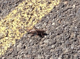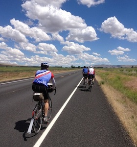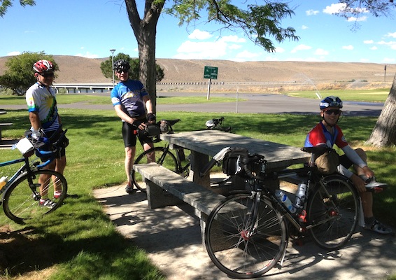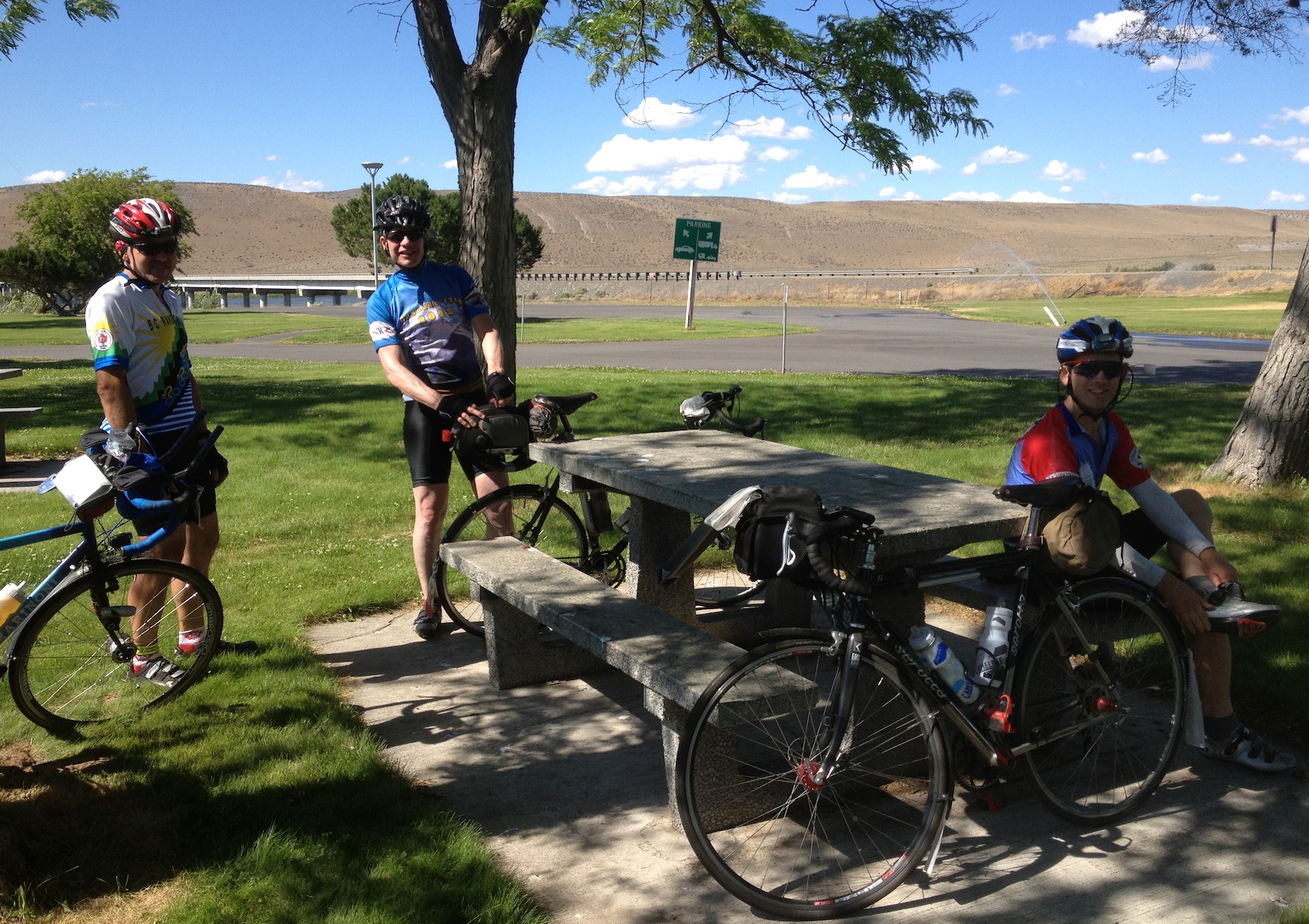 After riding through fields of 'Pacific Northwest Hops' against a Big Sky horizon with the kind of puffy white clouds usually reserved for the intro to The Simpson's for an hour or so the road developed a slight incline and we struggled to find a pace to keep the group together. Eventually Ward dropped off but Gary said he didn't feel bad because the roles had been reversed many times in the past. Just before the top of the rise, though, it was Bob's turn to flat. The ibuprofen had worked its magic by this point and we were clicking off some serious km/h so this was a bit of a letdown but I pulled over to help as best I could. Gary, who had just asked us not to go nuts on our upcoming pulls, said he was going to lie down under the trees at the top of the rise and continued on. Ward came up on us a few minutes later and we let him know where Gary was so he kept going. As Bob was finishing up the change I noticed Gary riding towards us in the distance and when I waved he nodded and rode away--I assumed this meant we'd see him somewhere down the road. Once Bob and I were over the rise the road dropped away for miles and bent a bit and making what had been a crosswind into a tailwind. Happy Days were here again! After 25minutes of Ludicrous Speed I caught sight of Gary in the distance. At the base of the next climb, I asked him if Ward was still napping under the trees and Gary said that he was actually ahead of us. At this point Gary began sharing his knowledge of the geography of the area talking about the famous 'gaps' in the river canyon and telling us how he was, "...excited to see the river because this is one of the last free flowing sections of the Columbia. Up a ahead is Hanford so they aren't allowed to dam the river there." Upon arrival at the Hanford gate (239km) the sign in question had been moved back from the road to the booth and Gary decided that a photograph was not worth drawing the ire of the (presumably armed) guard and we turned north toward the river. There was a sweet downhill runout into the Columbia valley and a rest stop where we rejoined Ward and could refilled out bottles. As the others enjoyed vending machine Pepsi's in in the shade and I reapplied sunscreen, Gary pointed out the hill we'd be climbing out of the valley on the other side of the bridge--it looked vertical. "There has to be another way", I found myself protesting out loud. The river, much like the Fraser back home, was running really high and what I believe we're trees now appeared as shrubs since any visible stumps were covered but the swollen river. As we turned into the climb I downshifted, upped my cadence and was soon alone. As I hit the steepest Waiting for Gary and Ward at the top allowed me to snap some cool pics the of them climbing as well as shots of the dunes and these weird grashopper/cockroach hybrids that were all over the road. The things were huge and some of them were even cannibalizing their unfortunate mates who had come out worse for wear interacting with passing vehicles. It was a fairly flat run to Mattawa after that and I was able to indulge my farm equipment obsession with a few photographs. It's probably a side effect of an urban upbringing, but I find myself captivated by all makes of tractors, irrigation sprinklers and hay balers. The party was broken up by a turn westward into the wind where I found myself feeling it and towing the group for long sections into the control. Gary was really having a tough go of it in the last 10km and even I was ready for a break when we hit the control (271km). Cookies, cola and chips and a sandwich were on order at the control in Mattawa but the eye opening thing was the amount of Spanish names on the businesses in town-there were tiendas, taquerrias and mercados everywhere. A 10 year old boy with a BMX hanging around the control tent checking out the bikes and riders was asked if he ever rides on the road like we do. "Nah, I'm not allowed. My mom says I'll get killed", he replied sheepishly. As we finished up our snacks another Rando in a polka dot jersey went flying by the control eliciting a chase from yelling volunteers. The 'King of the Mountains' turned around and joined us in the shade. "I though you were a fruit stand!" he laughed. We posed for a photo after he polished off a sandwich and we all left together. Gary saw Bob coming over the rise before the control as we left and although I was glad to see he was ok, I felt we'd spent too much time in the control already so I figured I'd see him at the sleep control. At the bottom of the hill the KOM took the turn at full speed and was gone. I was taking long pulls along the Columbia through a stunning gap when we hit a plague-of-locusts-thick cloud of insects in a marshy stretch of road. Now I hate bugs almost as much as Indiana Jones Hates Snakes. When we turned off the highway onto Beverly Burke Way (285km) there was another SIR (You've Got'em, We Climb'em,) hill and I spun ahead of Gary and Ward. Gary rejoined me in the flats on top but Ward seemed done for the day. While Gary and I rode through some rolling hills and even under a sprinkler(!) he told me about his ShimErgo set up of 10 speed Campy leves and an 8 speed Smimano cassette. Eventually the unrelenting hills conspired to separate us and i was left to enjoy a setting sun descent off the Columbia Plateau towards I-90. As I bumped along the frontage road I passed our friend the KOM who was changing a flat. I was flying now and really enjoying the low light as I passed through a field of peppermint just outside Quincy. When I got into the school and handed over my card I asked where all the other bikes were and they said that only four other riders had come in. Wow, I felt like I'd had a good ride but not that good! I did a solid 20 minutes of stretching and yoga, had a shower and enjoyed several helpings of chili to celebrate. It turned out Gary had stopped for water and came in with Ward while Bob had changed his tire/t