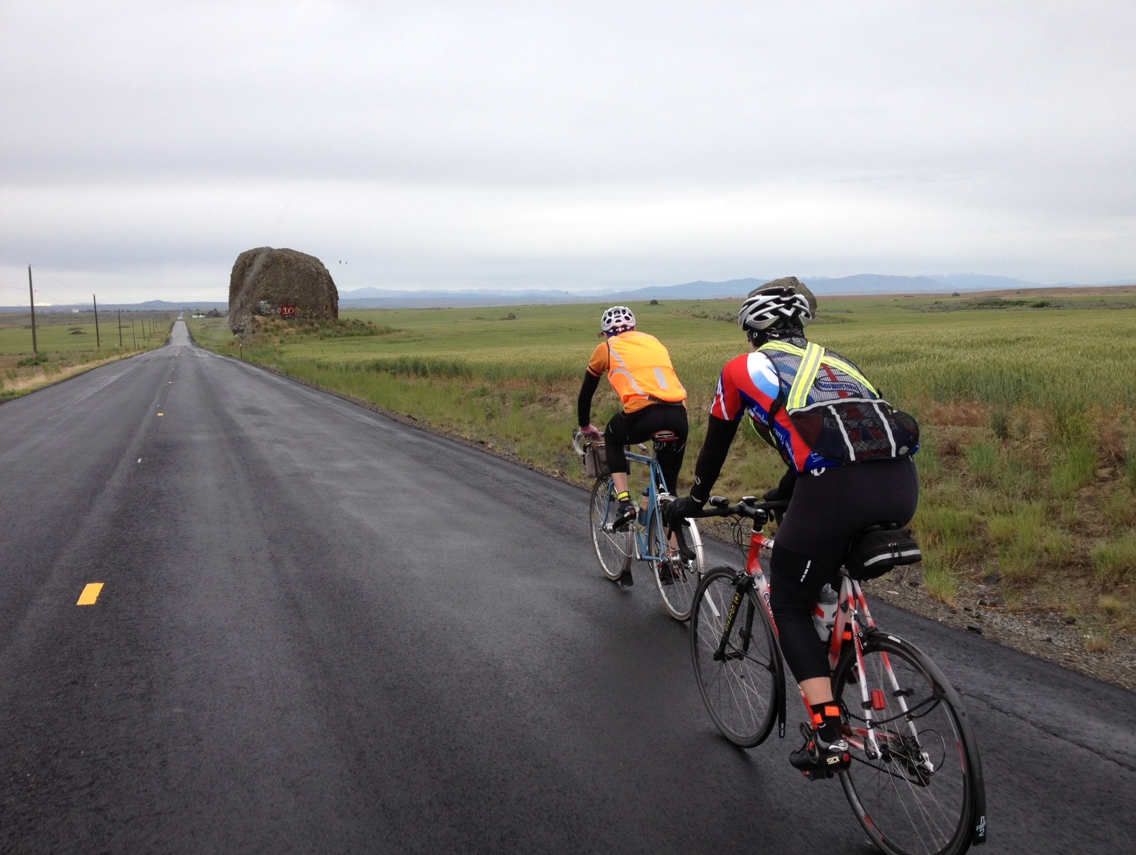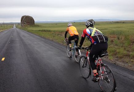 Cascade 1200 - Day 3 In four parts: Day 1 - Day 2 - Day 3 - Day 4 I awake in a panic... Who the #€$! is grabbing my arm?!? I am blind and a lack of audio feedback makes me feel like I am underwater. I swipe the eye mask off and thrash against the hand on my arm. A Cylon's red optical sensor singes my retinas and I hear muffled words before he moves on to the next 4am wake up call. I pop out the ear plugs that couldn't keep out the noise of some binner helping himself to an outdoor bottle receptacle last night (but somehow kept me from hearing the wake up guy) and gather up my sleeping kit. I stumble through the void of the windowless combatives room and out into the sodium light of a high school parking lot. I have decided that since I ended so strongly yesterday and since this is the shortest ride between overnight controls I will try to hang with the big dogs today. After breakfast I tentatively approach Keith Fraser and ask if I could try riding with him and Nigel Press to start the day and he simply said, "Sure, let's go." As we leave the building and clip in I realize I haven't started my GPS so I have to stop while the satellites are acquired. Nigel and Keith roll out of the parking lot and I sprint to catch them at the end of the street. Although it is still dark just before 5am, we are not the first out. As we bump along the backroads northeast of Quincy we begin to pass some of the veterans in the field who know they need to depart before the strongest riders like Nigel and Keith in order to make the controls in time. The cross/headwind begins to pick up and I notice that Keith is sitting in draft on an angle like I've read about in magazines and seen pros do on TV. I have to remain focused though--I'm trying to hold my line, point out the obstacles and take my share of pulls at a brisk pace (I usually try to start rides slowly) Essentially, I'm riding on my best behavior lest I disappoint the cream of the Cascade 1200 crop. Although I would soon discover that these are two of the nicest guys I'll meet in the Rando world, at this point I feel like an interloper and am determined not to let my new ride partners down. When we turn directly into the north wind on Basin street in Ephrata I take a good pull and try to position myself to give the guys maximum shelter. I am feeling pretty good but in preparation for what could be a challenging day, I begin to eat earlier in an effort to avoid bonking. Turning into the Moses Coulee at Soap Lake, the pulls get shorter and much more intense. The winds were swirling now and when we cross the lake on a causeway we are almost blown over. It's the first time in my life I actually have to lean into a crosswind to prevent being blown over. I am grateful to be with an experienced rider like Keith who provides advice and models proper technique and positioning. Nigel set a pretty good pace on the climb out of the coulee up to Dry Falls and then I pull through and do everything I can to maintain the group's pace. This is the best tempo I've had on a climb all year. I am stoked to be riding this strong with the Best of the Best but as the road levels off and the Visitor's Centre comes into view Keith takes over and I pop off the back. As I soft pedal into the parking lot I try to reasure myself that I took the foot off the gas when I saw the control. Glancing at my computer I see there was still 200km to go! Nice going. This is gonna be a long day. Dry Falls is a cliff basin (Hanging Valley? I really should know this stuff...) formed by ice age meltwater kajillions of years ago and there was a sign in the display case (that looked like it came from a coloring book for kids) reminding visitors that all fossils in National Parks, "...belong to The Man." After cramming in a pb&j out of the wind we pulled back onto the road and the tailwind kept the group together for a few minutes until we switchbacked almost 180 degrees on Hwy 2 and began climbing. It became apparent that the deadness in my legs before the control was clearly not an illusion. When we got off #2 onto WA#17 the road continued upwards and I began a pattern that would hold for the rest of the day: falling behind on the climbs and tucking/hammering the downhills to catch up. Once I'd re-joined the guys I'd ride at my limit for the flats and (on Keith's suggestion) take short (1-3min) pulls. It began to rain at this point and, despite working pretty hard just to hang, the wind chill meant I was getting pretty cold. As I sat up on a downhill to put on my jacket I looked up (I'd been staring at Nigel's back tire for almost 20min!) to see miles and miles of glacial erratics dotting the fields outside of Mansfield. The rolling hills and irrepressible crosswinds continued for the next 20km until we reached the first manned control of the day in town. "I'll take ham and swiss on whole wheat. I need to pump my tires and get out quick so I can drop these two", I said to the volunteers as we rolled up. "They've been sucking my wheel all morning!" We heard that we were the first guys through and then shared the weather report about the winds in the Moses Coulee. I was worried there'd be some DNF's there after people had fought through rain day one and heat on day two swirling cross headwinds might be the last straw. After some outstanding pasta salad to follow the sandwiches and cookies we were back on the road. When the terrain started rolling again I had to lost contact with Nigel and Keith and told them to go because my legs just weren't feeling it at this point. I figured I'd be alone for the rest of the day (150km) but an extended downhill into Bridegport allowed me make up the kilometer or so that I'd lost in the rollers so I was back in the group. The sun was making a breakthrough as we rode through hobby farms spread along the Columbia towards Brewster and I began shedding my hat, arm warmers and long fingered gloves every time I was at the back of the group. I was riding behind Keith now 