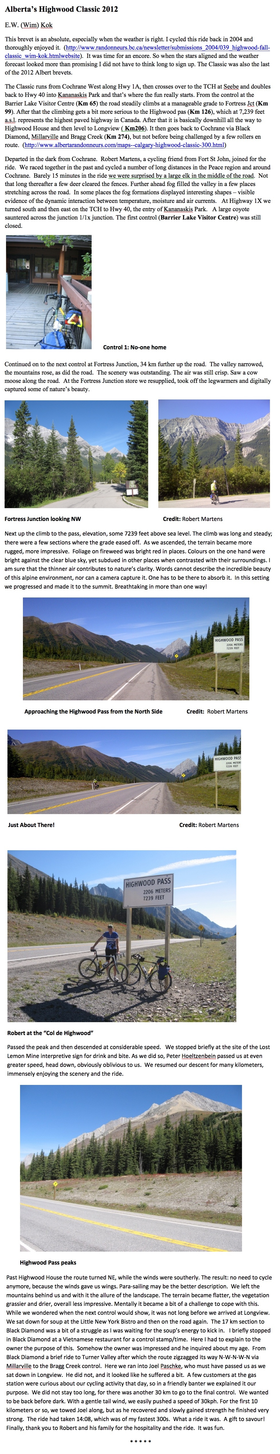 This is Wim's report from the Highwood Classic 300 on September 8, 2012. Notice that it is a jpg, and so the links are not clickable. Wim origial word doc is linked at the bottom of the page. EF