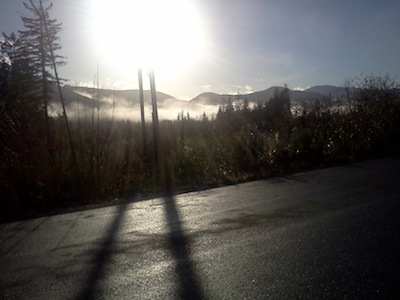 On my way downhill to Port Renfrew, I didn't want to take a chance on the icy road so I rode most of it on the shoulder at a slow speed.