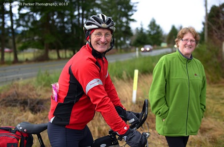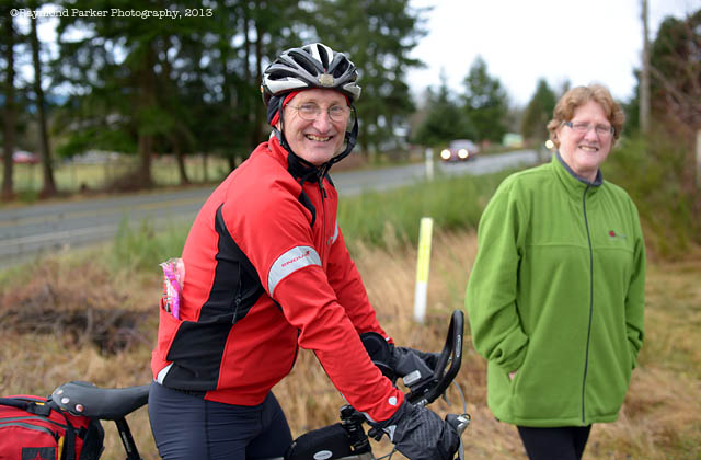 Permanent #37 Coincidence Graham was out riding his second February permanent when he met up some mutual friends. Ray Parker is a past Vancouver Island brevet coordinator. Ray provided the photo of Graham and Amanda above. [EF] I was out on the road again yesterday completing Permanent #37, Pacific Shoreline, 201 km (Feb. 10th). Time: 8:47 An interesting highlight of the ride happened while cruising along the road between Courtenay and Campbell River. A car pulled up beside me while I heard the passenger window roll down. It was Ray and Amanda heading home after an overnight retreat at a local resort. We met up further down the road and had a nice long talk. The other highlight was witnessing about 5-600 Trumpeter Swans in a roadside field near Courtenay. I had drizzle most of the day but I am not complaining for this time of the year! Consider the alternatives back east!