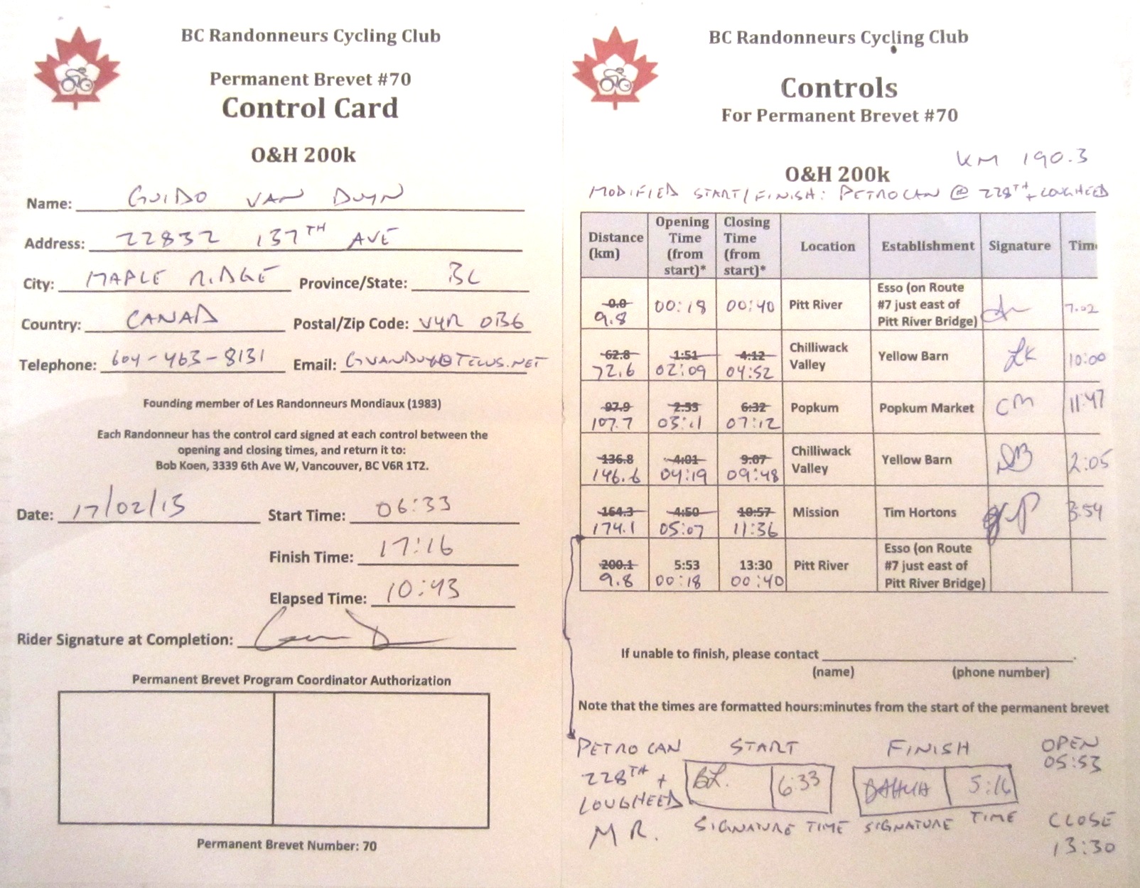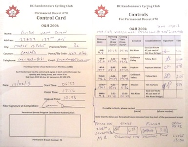O & H - Starting in the Middle I liked the job Guido did in modifying his route #70 control card. I thought it provided an opportunity to remind riders of the option of starting any permanent in the middle, and how to make this work on your control card. Thanks Guido. [EF] Hi Eric, Yesterday I enjoyed riding Harold Bridge's O&H 200 with an elapsed time of 10:43. It was very nice riding some of the familiar roads east through the Fraser Valley. Some roads that were new to me included Camp River Road and Hope River Road which starts under the Agassiz/Rosedale Bridge and travels west along the Fraser River to Chilliwack. I have included a photo of my route card which shows how I modified my start so that I could begin the ride closer to my home, I though it would be difficult but it was not, thanks to your excellent instructions. All in all another enjoyable ride, no rain though I did get chased by dogs, but that's another story..... Thanks!
