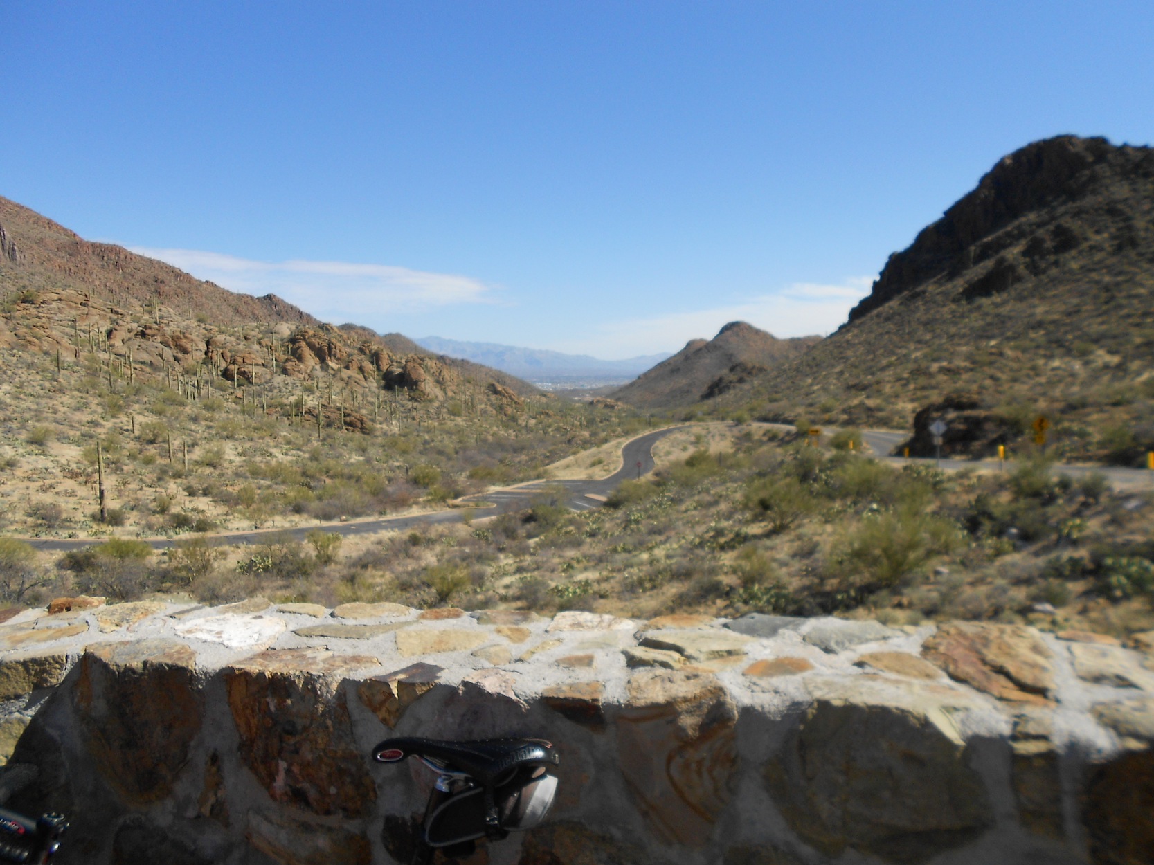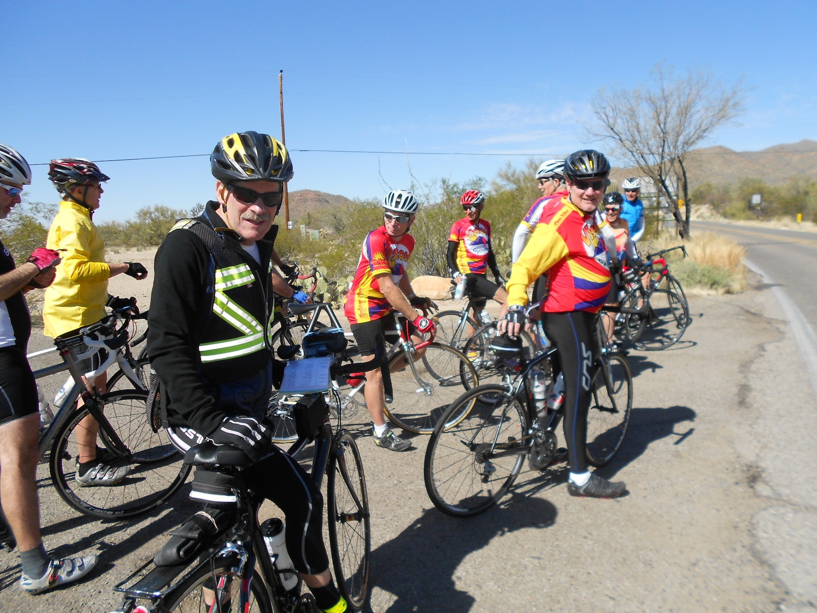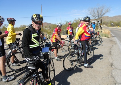 My Desert Winter Training Program Over the years I've seriously considered signing up for one of the PAC -Arizona Tours, but why pay the big bucks when a more affordable option is available. Here is my story. A good friend of mine, Dave Goodman, has become a bona fide 'Snowbird' spending the better part of 6 months a year in the community of Oro Valley just north of Tucson. Some of you may has seen Dave as he was part on my Fleche team in 2010. He is an avid and very strong cyclist although he doesn't look the part. He is a big man and he rides in 'street' clothes. His only concession to cycling apparel are cycle shoes and of course a helmet ( Note: Dave pioneered some of the earliest research in sports caused concussions). Oro Valley is the home of the Vistoso Cycle Club comprised mostly of 'Snowbirds' and year round retirees, many of whom are very fast, strong riders. Some years ago when I rode a 200km permanent while visiting with Dave, I jokingly suggested he organize a poor man's version of the PAC Arizona Desert training camps. Well he and some of his fellow club members did just that. This was the second year of Cycle Mania held over 11days. Dave and his wife Corinna ( who has several podium finishes at the World Masters Triathlon Championships and was just named the USA Masters Duathlon Athlete of the Year) graciously hosted us and arranged a tandem for Sheryl and me to use on the the more leisurely bistro rides. Our first day (a Friday) was a 90km ride ( on the tandem) to downtown Tucson. Tucson is one bike friendly place. The drivers are extremely courteous and the network of bicycle paths is astounding. This route was 30km down, 30km flat, and a 30km climb home. Saturday Dave and I rode in the Greater Arizona Bicycle Association Picacho Peak Century. The route passed nearby the Vistoso Club's daily rendezvous site so the decision was to start the ride there. Five of us met at 6:30 AM to ride 35km to the official start location. It was almost all downhill and it was high desert COLD!!!!! Another group of Vistoso riders, and five riders who travelled from Chicago to partake in Cycle Mania met us there and we were off, at a hellishly fast pace that was to hold for the next 30km. This was nuts! Most of the next 70km was uphill into varying head winds. Thankfully, most of the remaining route was downhill but for that same climb back to Sun City in the upper suburbs of Oro Valley. The weather for the next several days was looking iffy, particularly for the Wednesday, the day for the Rollie Pollie a 100km romp with approx. 4800ft of climbing. The decision was to move the Rollie to Monday. The prospect of this much climbing thinned the group off to a few of the diehard locals, the Chicago gang and me. At the turn around point the route had this 300m, 25% pitch aptly called 'Hell Hill'. I was one of the five who made it up without getting off the bike. My tested max heart rate is 157bpm. When I hit the top my, HR was over 170bpm. There was lots of climbing to come, but it was anti-climatic, and of course there was that climb back up to Sun City, Oro Valley. Tuesday was another 100km day ride over Gates Pass. This is the pass that Ben Coli had his nasty crash on last year. The climb was not that bad, but oh the descent. The road is steep, twisty and very rough. The steep and twisty I can handle, but the rough with furious, gusty cross winds reminded me that I'd like to live to see my grandchildren graduate from high school. At the bottom my hands were sore from braking so damned hard much of the way down. When we grouped up at the bottom of the hill, the talk was all about this couple who just blasted down the mountain ( they went by me like I was stopped). She was tucked in behind her partner, both pedaling flat out. It was beautiful to watch. At one point where the road straightened out and was smoother, I released the brakes too see if I could stay with them..I was instantaneously up to 70kph+. They just pulled away, humbling! Then we had the ride of our dreams.....ten miles virtually straight, slightly downhill, with a 30mph tailwind. Our average speed for this stretch of road was near 50kph. As was forecast Wednesday did not not look too promising, and only a handful of riders showed up for the daily ride. The locals don't ride when there is the slightest hint of rain. The destination was to a eatery called 'Beyond Bread', a 25km ride. Sheryl and I were on the tandem and dropped the small group on a steep downhill. Bad move when you don't know the intended route. We found ourselves alone, but as we knew where to go we thought we would continue on and meet them there. At the 20km it started to rain. We were the first to the cafe, and as it was to turn out the only ones to get there. The others turned back at the first rain drop. A good call. The rain got heavier....and heavier. It was going to be a cold wet ride home ( the temperature was about 4C). Off we headed and were soaked to the skin within minutes. This was no fun at all. We could feel the temperature dropping and the wind getting stronger; we were freezing. The rain was falling horizontally... it began to sting as it hit our exposed skin. Then in a flash we were riding in a complete white-out, a BLIZZARD! It's not supposed to snow in Tucson; this is a desert! On that final climb my hands were frozen and ice was building up on the shifters. I had to use both hands to shift either shifter. Then an angel appeared! A crewcab pickup slowed beside us and we heard her voice. The driver, Liz, sensing our situation and desperation called out the window, "You kids shouldn't be riding in this, throw your bike in the back, I'll give you a ride home, get in". By evening there were over 5cm of snow blanketing the roads, the cacti, everything; it was magically surreal. The locals were in disbelief, so were we. Thursday was another leisurely day ( 80km) with Sheryl on the tandem to another eatery called AJ's. The plan for Saturday was to r