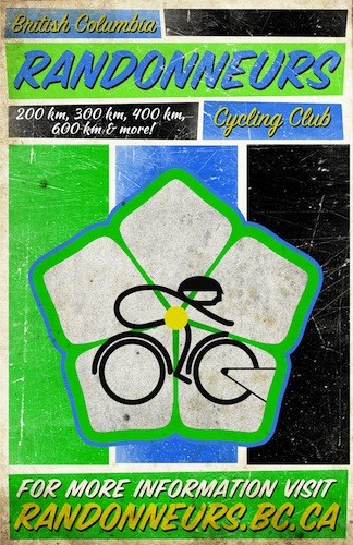 BC Randonneur Promotional Poster Our brevet coordinator on the Island Mike Croy, is doing some interesting work. "This is something I have been working on with a graphic designer and Ryan and Chris. This is going to be going up in Bike shop, etc." Amazing vintage stylings guys. (Click image for full-sized printable version.) You can find this anytime at its new permanent home on the organizers' logos and graphics page. EF