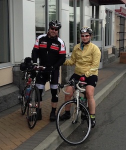 Highway to Hell 400 - Organizer's Report On Saturday Brynne and I hosted the Vancouver Island Highway To Hell 400 km brevet. In all aspects the ride was a huge success with 8 riders starting and 8 riders finishing. Those that didn't stay the night arrived at our house bright-eyed and busy-tailed by 3 am and left again as quickly as they arrived, riding off into early morning's hushed darkness. Kristy Mighton manned the first control in Nanaimo at McDonalds. Then The Denman Randonneur, John McGillivray, staffed the next control in Union Bay with his usual amazing spread of goodies. A crowd welcomed early riders back, thinning steadily until only Brynne and I remained to welcome the last two rain-soaked and weary souls. We were incredibly pleased to be able to present Cynthia Wood with her first 400 km finisher's pin. She is close to a full series now, perhaps we'll have another woman for the SR ranks by the end of this year. I was doubly impressed this time around, both by the speed of the first riders and the perseverance of the last ones. Adding to the significance was the fact that this was a first 400 for half of the riders on course. Every rider who came and rode the brevet are true Randonneurs in my eyes for totally different reasons. Thanks to all the riders who came and enjoyed the scenery of the island and made the spring V.I. 400 a success. Mike Croy (with Brynne and Steven Croy)