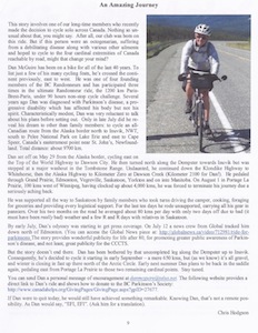 Dan McGuire's Amazing Journey Dan McGuire is one of Canada's original four randonneurs (photo). The four BC riders participated in Paris Brest Paris in 1979. Dan went on to complete three PBPs. He's now 80, he has Parkinson's and he's riding his bike across Canada. He continues to find ways to Amaze. This article from the Cross Canada Cycle Tour Society newsletter, reproduced with permission. [EF] Click... Go to: Cross Canada Cycle Tour Society (Home) Go to: Donate to Parkinson Society (Dan's dedicated page) Go to: News Clip Video (Link to Global News) September 2, 2013 |