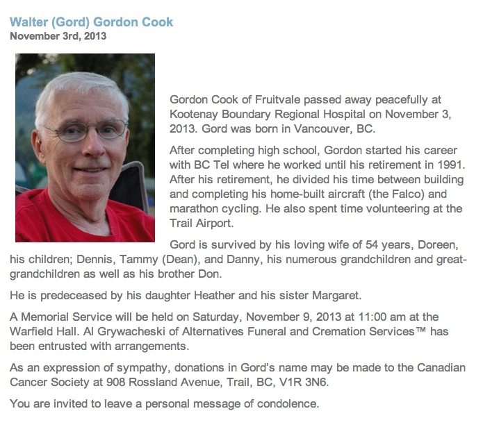 Gord Cook Remembered Walter Gordon Cook BC Randonneurs Member #330 Gord Cook, member 330, died on November 3, 2013. He started randonneur cycling in BC in 1990 and was an active rider through 2004. He was strong cyclist - especially fast over the shorter distances. He was also a long time member of the Randonneur Committee, and was Club President in 1994. Most recently he and wife Doreen staffed the Golden control at the 2008 Rocky Mt 1200. Thanks to Danelle Laidlaw for forwarding this sad news. Danelle found this link to his obituary. (Reproduced further down the page.) Additional (Dec 23 & 28): Photos of Gord are rolling in. Manfred Kuchenmuller found 21 of them. Bob Koen scanned the prints and put together a Picasa gallery - link at bottom of page. They are of varying image quality, but are a nice portrait of Gord. Danelle also sent in some photos taken by photographer Don Hollingshead on Tour BC from 2002-2008, and these too are now in Bob's gallery, linked below. Immediately below is a link to Manfred reflections/memoral written later in 2013.
