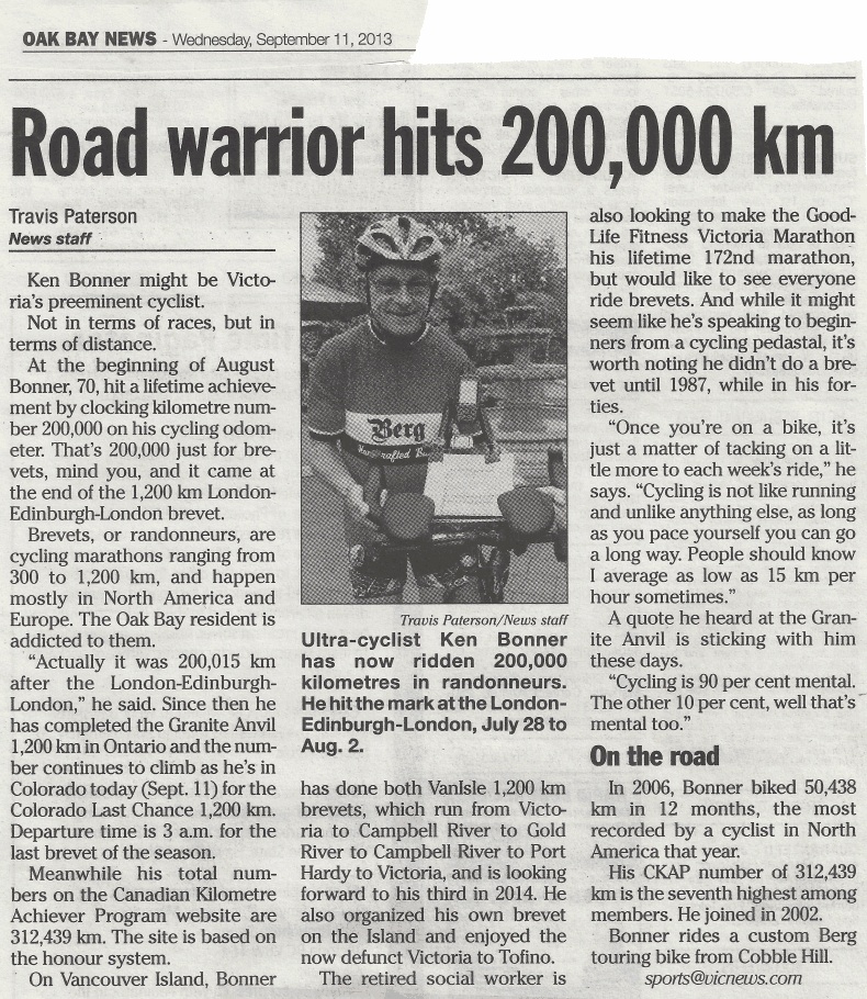 Road warrior hits 200,000 km Thanks to Bob Koen for pointing me to this article marking Ken Bonner's 200,000 event distance total. [EF]