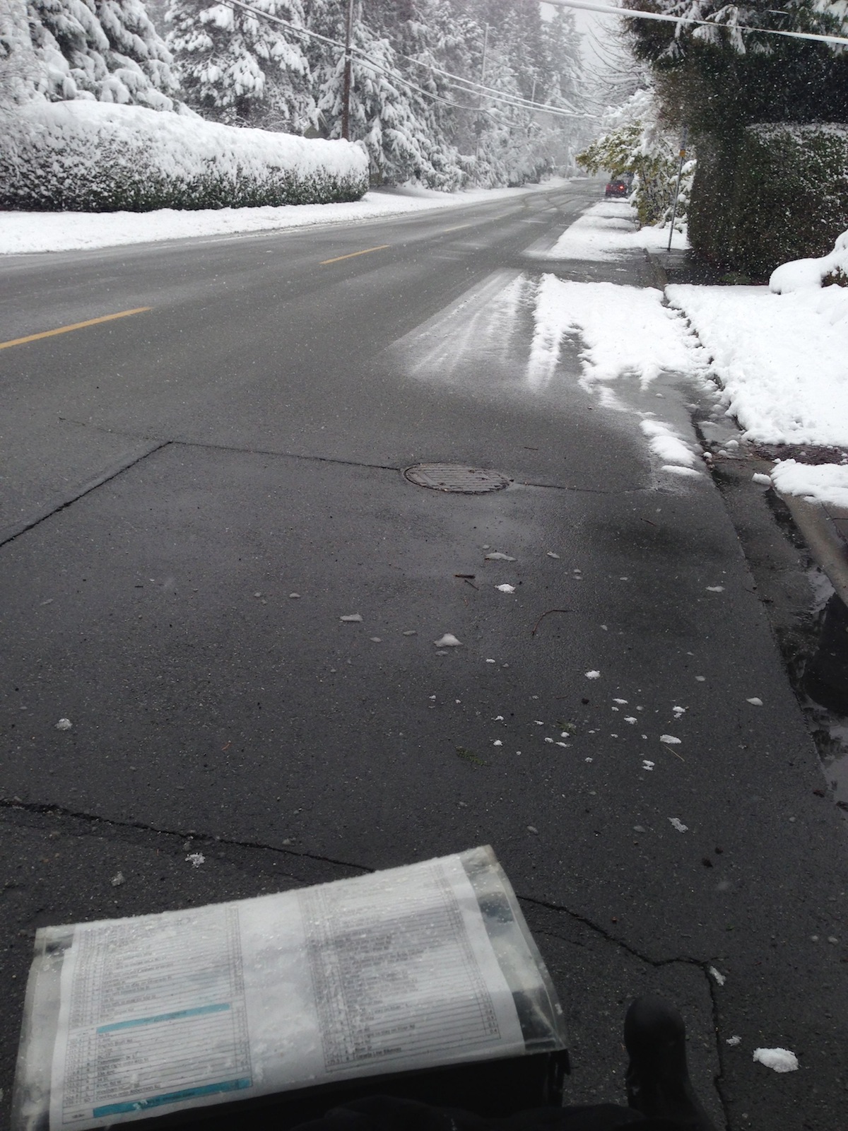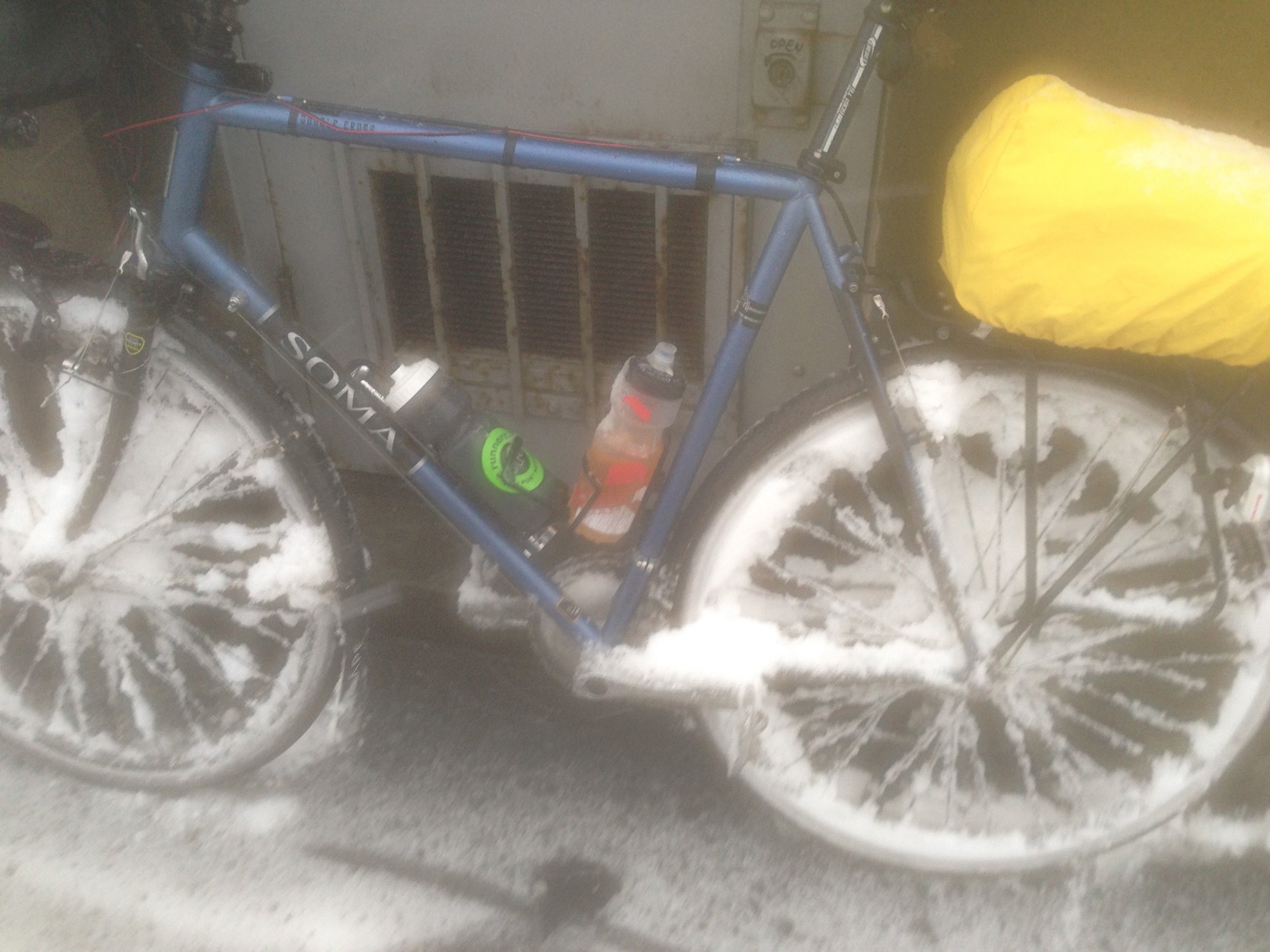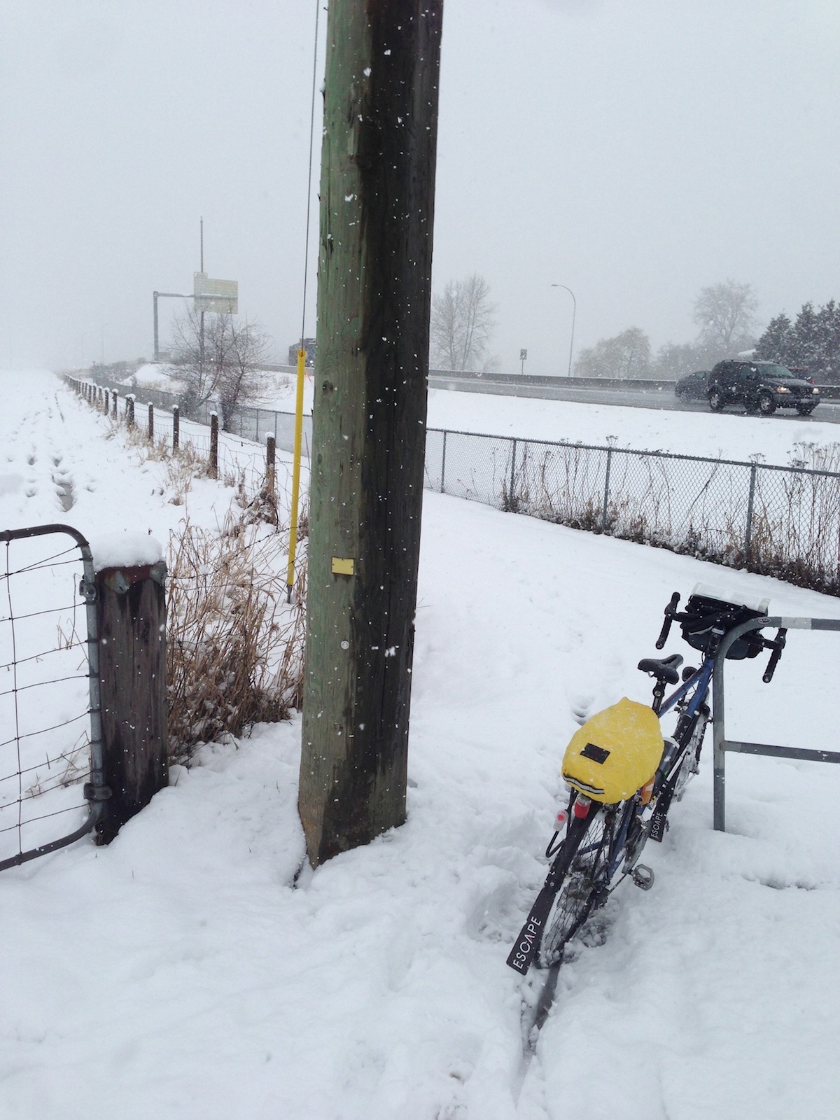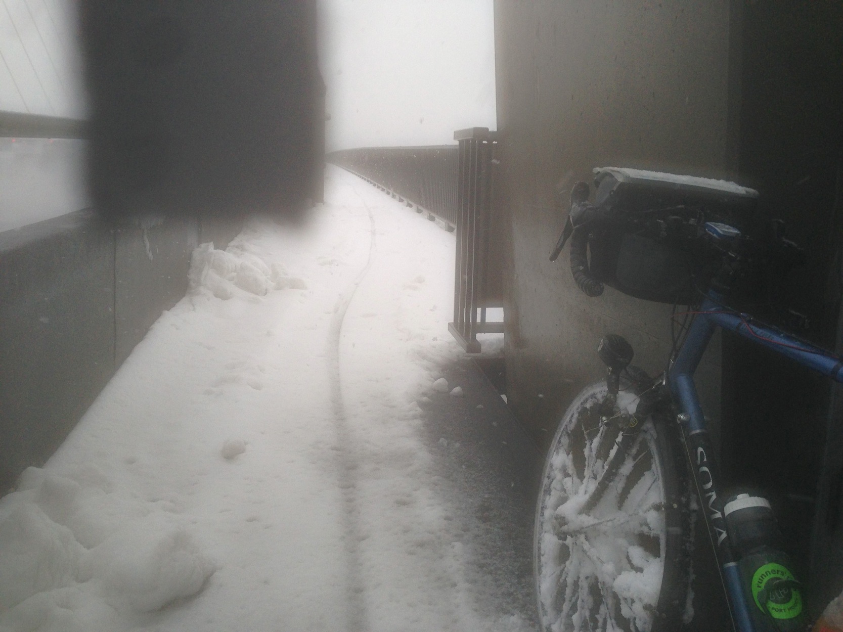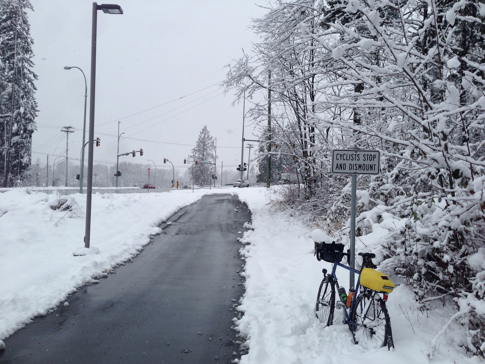 Follow the Fraser Étienne Hossack This permanent was originally scheduled for the 23rd, but due to unforseen circumstances two had to bail, one was unable to cope with the cold (from down south you see), and the others had cold feet at the weather. I ended up with the cold feet in the end :-| This was to culminate my school week off (riding week as I like to call it) with a nice fast fun 200. Of course the entire week was sunny and the weekend was forecasted to be rainy, but I could live with that. Of course, come Thursday, the forecast changed to snow. Saturday it started its thing, and we looked at the route I had originally chosen with some trepidation, so I created another permanent to be test-ridden with a safer, less elevation-y route. But by Sunday morning even I decided it would be best to wait until Monday (skipping a day of class teehee) and to go riding. This was of course at my friend's suggestion, but he bailed on me due to work. Love the friends! So Monday morning I set out with high hopes that the snowing would change to raining and then the roads would clear. Alas. Luckily I had the clothing down pat and ended up almost entirely dry and warm by the end of the day. Except for the feet (see below). It ended up forcing me to be verrrryy slow. Setting off at 7:30 from Siegel's Bagels, the first section out to Coquitlam was relatively straightforward, cold and a bit snowy, but nothing to bother. It was a cruise down the Still, the bike paths were clear over the Golden Ears and up to the top of 172 so I was still hopeful. The route was to take the new South Fraser Perimeter Road all the way down from its start to Tsawwassen. This was for the better portion decent. On a rainy day, there isn't a ton of shoulder space as the grit tends to get washed and spread out, but having ridden it the week before with Alex Pope, I don't think it was too bad. The sections from North Delta down to South Delta proved... interesting with the snow. Shoulder space was limited and a bunch of time was spent hopping between tire tracks trying to maintain a clean route. Still, very doable. There was one strange section of the road where the bike route exited and took an underpass, onto Ladner Trunk Road, and back on. I'm not sure if this can be skipped, but I would recommend looking into it as it wasn't very efficient. Rejoining the SFPR for the last section into Delta, I began to experience some gear slippage, but brushed it off as nothing. Turning onto 52, I was delighted to see the next km of my Riding out to Westham Island and the Reifel Bird Sanctuary is a ride I do often with my mother, and I am no stranger to the route, but in the snow... well... The bridge to the Island is wood and metal, and should be ridden with care. I ended up having to walk it due to the snow. Oh dear. It was also at that point that I realised why my gears were slipping. Being new to the whole bike-thing this past year, and also being new to riding in the snow, I was suprised to see my lower cogs jammed up with snow. Aha! That was the problem! So I stopped to clear them out, but really never got it to work, and rode pretty much the rest of the route without the 12-13-14-15 options. Not terrible, but did lower my speeds on certain sections like River Rd. Returning was really a bit of a challenge, and once again a slow walk over the Westham Island bridge. Riding into Ladner, I made a quick stop in Save-On-Foods to try and melt the snow off my cassette to get those gears - this worked for a bit, but I still didn't have them again after 62nd. River Rd itself was a bit of a mess. Absolutely no shoulder, snow pouring down and lots of traffic passing VERY close. Not sure that was the safest, but I had all three of my flashy rear lights going. My front dynamo light quit about then though. It had had enough. Reaching the bridge, I had another fun time taking the old River Rd exit/bike path in 3inches of snow before a brief (but very dry and thankful) respite under the Alex Fraser itself. I followed the route up until the bridge start, but then my walking began. I did not want to risk riding on They were suprisingly dry though, until I walked through some slush on the way down. Darn. At least my two pairs of wool socks kept me warm. Also, some dude passed me riding his bike on the way down the bridge? Talk about fearless.... This was the only section I can say I didn't enjoy (who knows why the rest was fun, but... it was?