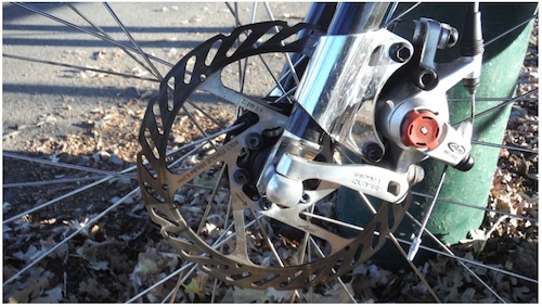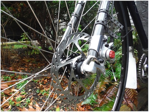Experimenting with a Front Disc Brake Disc brakes are pretty standard now on mtb's, but for the road they seem to be a solution looking for a problem. They provide much better modulation, but mechanical disks don't provide as much maximum power, and they are heavier than caliper brakes when you factor in that heavy steel rotor. They are a good excuse for using carbon fiber rims, but the major advantage is in saving the front rim in wet and dirty winter riding. I have been experimenting with a front disc brake this past winter, and I am impressed with its capabilities. I would recommend a front disc for winter riding on the road, but would also conclude that a rear disc is unnecessary and superfluous, unless you are set on using carbon fiber wheels front and rear. The benefits, after 4,000 km of winter riding in the Pacific NW (and some riding in California):