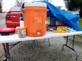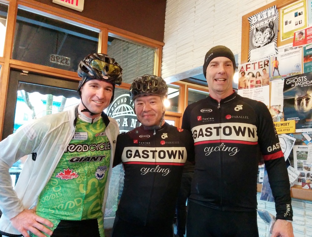 Early Bird 200 Organizer's Report The weather forecast leading up to the day was ominous, so I was excited to see that it was not yet raining when I awoke to go to the start at 6:25. I was pleasantly surprised to see a half dozen riders already sitting inside Bean Around the World with coffee and muffin in hand (the Cheryl and Nigel helped keep things in order at the start as riders trickled in near 7am. The rain gods cooperated for the first 1/3 of the day as riders enjoyed cloudy skies with only a mere sprinkle of rain here and there. James and I tried our best to keep the food dry for the riders at the Spanish Banks control with a tarp and lots of twine. The riders were treated to an elaborate control manned by Ali and Roger. Hot soup, coffee, tea and an assortment of goodies were enjoyed by all. James and I can attest - Roger's soup is "da bomb". See Ali and Roger's pictures of the control. As we packed up the control, the rain started in earnest and we all agreed that it was better to be volunteering today. We certainly were not envious of the riders!