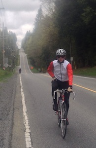 300 yay! [Etienne's story is accompanied by more photos: Étienne's Gallery - Pete's Gallery.] Preamble: Actual fun part! Thank you Chris for the awesome route! It was a fantabulous (yes, it's a real word. I checked in the dictionary of awesome words. It was there next to supragullible). At the start, the Escape Velocity folk and Patrick G. and Laith F. [1 - see note] debated on whether or not this would be a `fast' 300, as Pete and Patrick are more or less mountain goats on the hills and Tobin and I can do our fair dues on the flats, but after a bit of laziness, it seemed not to be the case. Riding out to Buntzen was fun - phew - some of those hills were a good wake-me-up.... Having never been all the way on a bike it was an interesting ride! And Chris had been so kind as to organize all those 'Race in Progress' signs for us, it was great :) But really, we had no idea why those were there, and why they followed the bike route so readily, but we weren't complaining! After the super fun rolling out and back, and then up, up the plateau the David descent is always fun, though I swear every time I get caught by that one light, right in the middle of the descent!!