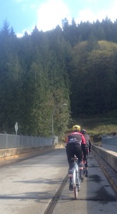 Rolling over the bridge and the Dewdney Trunk was a funderful section as always. I do love the Dewdney (growing up in Maple Ridge, no bias). We had a nice steady-ish pace and then stopped for a 2 second catchup at the shop past Camp Good Dog (I never knew the store/gas station name). It turned into a longer stop with snacks and bathrooms, but I suppose a rest is positive every now and then. We watched Gary B. and others roll by before taking off again and passing them. Down to the Dam is always a fun descent and we whizzed along the road each trying to pass the other in the most ridiculous aero poses. Eventually reaching the dam we rode along, but Patrick attempted to make the rail-track jump... and was not successful.