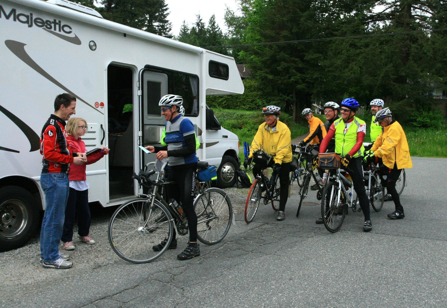 Concrete Seahorse 400 Organizer's Report Wasn't that a great weekend for a brevet, 34 starters gathered in Coquitlam to head south. On the pre ride we decided on a location for a secret control before the border, Alex thought it would be a good idea to bring his newly acquired Class C motorhome I dubbed the "Pope" mobile. Shortly after I arrived there at 7:40am the first riders appeared, and what a group it was, almost half the field. Danika Pope did a great job getting everyones cards processed. Spirits were high and appetites satiated as the field headed off towards the US border at Lynden. Rec'd a call from Phil Hall at 10:30. He and Jodi were on their first 400 a week after completing a 300. A knee issue caused them to withdraw in Lynden, they would make their way back to Coquitlam on their own. Great spirits, they plan on more brevets. The lead group came in at 9:25 with the balance spread out over the next 7 hrs. It was when Nigel & Cheryl arrived I was puzzled about John & Malou on the 2nd of 3 tandems in the field. Turned out they had organized a planned stop to inspect a new tandem and were swaping components from theirs to test compatability. Lantern Rouge was Ross Nichol, he was out there. A late start and then a few navigation issues meant he never was able to catch up to the group.