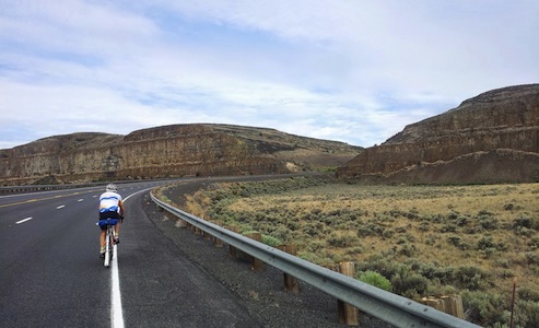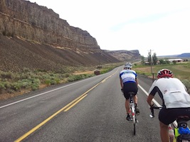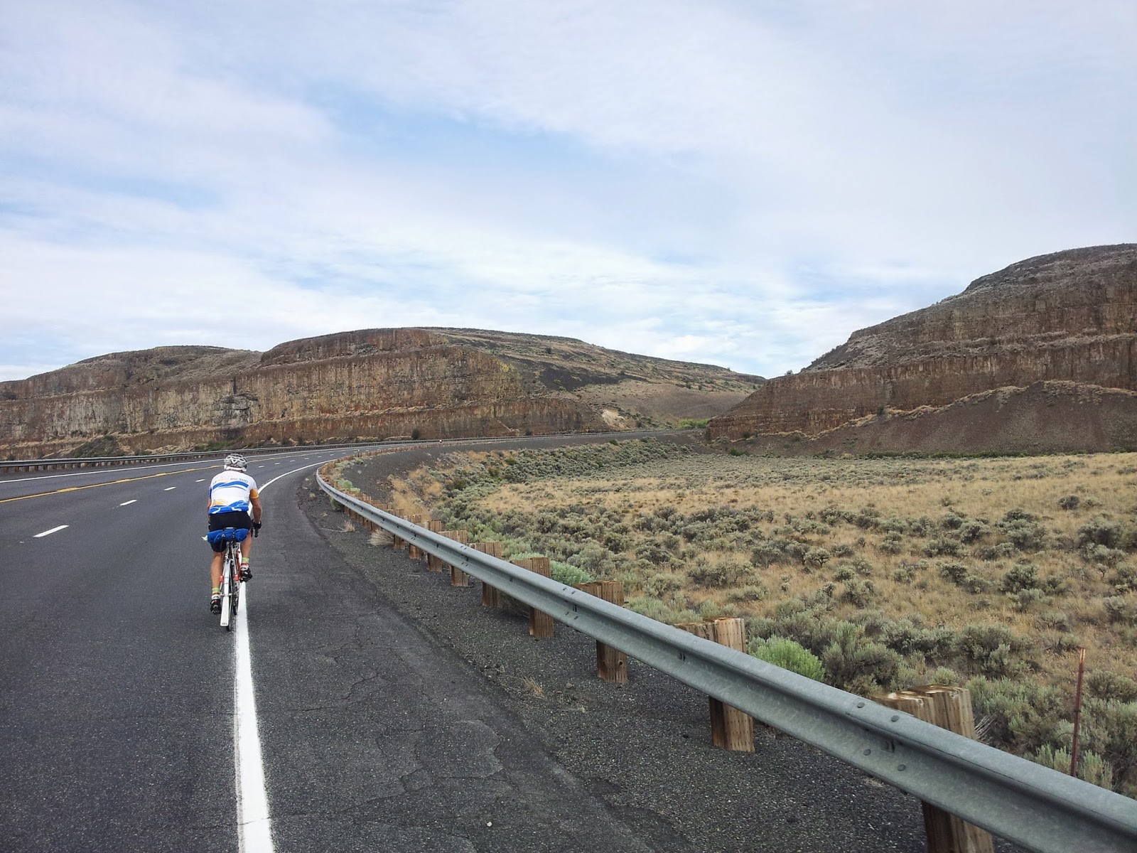 Rooming with SIR's Theo Roffe and Chris Cullum, I got even less sleep than the previous night. I just couldn't get comfortable. I was hot again and wasn't partial toward the pillow whilst sharing a bed with Theo.... I tried the floor.... then some couch cushions on the floor...and finally the bed with Chris and got to sleep for another couple of hours. Yes, I know all the PBP anciens are snickering about 'first world problems' and saying 'Wait 'til you try and sleep under a table at a control in Carhaix!'. Look, I get it. You are not feeling sympathy towards my lack of sleep or towards my being uncomfortable during my SECOND night in a BED on a 1200. I'm just sayin', that's all... Breakfast was reasonable and after heading back to the room to put on our kit--the less time spent in chamois & shoes the better!--we got down to the lobby in short order only to discover technical difficulties with the Action Cam. After a bit of RTFM I got it going and we were off just in time to depart with Chris Ragsdale and Mick Walsh. Unfortunately, they pushed through a yellow that, in the interest of safety, we stopped for. So sadly, we lost them. This year's route included a climb up Sagebrush Flats Road and the ride through Moses Coulee, which had been closed during the previous edition of the C1200. It was absolutely stunning. Ranchlands turned to wheat fields and then to glacial flood-carved coulee walls. All of this with gentle grades and smooth flowing downhills at sunrise... My cadence was now fully in synch with my bike and Chris and I were sliding past many of the early starters on the climb until we found a good rhythm with Hugh Kimball, an SIR member on a single speed and Dan, an Australian who we had spent some time with on the first day and whom we now referred to as "Mask of Pain" because no matter what the terrain, he was always bent over in the drops like he was battling headwinds on a solo breakaway. Hugh said he rode single speeds ever since he busted a derailleur 50km into a Flèche and still finished with only one gear. He liked it so much he got a new bike sans derailleurs.