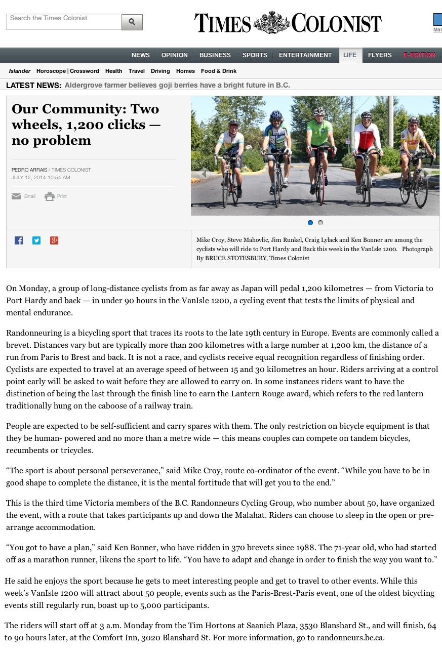 Two Wheels, 1,200 clicks - no problem VanIsle 1200 Ride dates: July 14-18, 2014 by Victoria Times Colonist