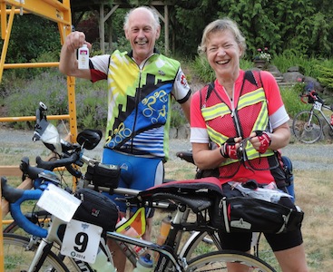 Bob Koen and Kathy Brouse were two of just under 50 riders that passed through the Yellow Point Control at the 97.8 km mark of the Van Isle 1200. All riders were through the control before 8 A.M. Most of them took advantage of a breakfast of maple baked French toast, home made granola, yogurt and other goodies. Riding conditions so far have been close to ideal with little wind, but the day will soon become hot. Despite a few mechanical issues, including a broken spoke and bent rim, all is going well.