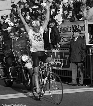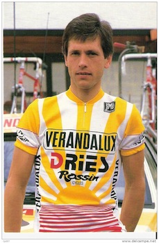 BC Randonneurs "Bumble Bee" Jersey Design Origins... "Hennie Kuiper winning the Giro di Lombardia 1981. I always thought that this jersey was an original design." Michel Richard sent this message and the two images above to the club discussion list in October of this year. The information I have on our original 1991 bumble bee jersey design is relayed in the clothing history section on this page GO. This is what I say there: "I asked Harold [Bridge] to look into this and here's the word:" "Eric, I spoke to Dan McG [McGuire] tonight. He thinks David Johnstone got the woman who ran the clothing company in Ontario to come up with the original design of the 'Bumble Bee' jersey. H." (March 2002) The above photos from Michel put this statement in doubt. Perhaps the woman in Ontario borrowed the design. Here are examples of a couple of our club jersey designs: