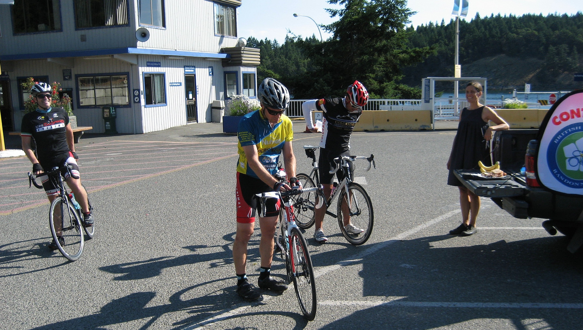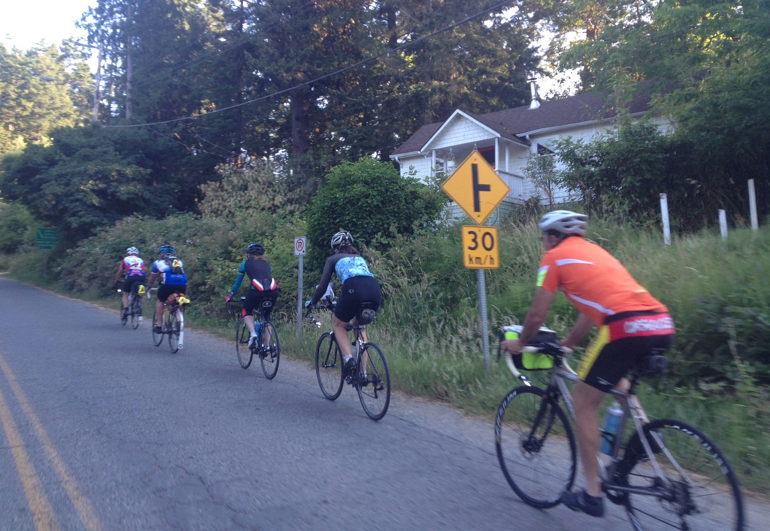 The Saltspring Surprise I was initially a little ambivalent about doing this ride. Sure, I love Saltspring and love riding on it, but the route looked daunting (2500km of elevation gain) and it was the first Saturday of summer so, with Saturday market going full tilt, I was pretty sure the island would be super busy. And, I was wary about the heat which was promising to hit towards 30 degrees in the afternoon. However, all of that was all for naught. I have to say, this is one of the most enjoyable 200s I have ridden on... and that is saying something. This is a brand new route, created by the super team of Holland Gidney and Dave Campbell and a lot of time, energy and planning went into creating it. You see this right from the beginning. The ride started at the ferry terminal at Fulford Harbour, so we had the 7:00 ferry ride to acquaint ourselves with each other and to register. In the future, I would suggest people buy and load an "Experience BC card"... you save $5.90 on a ferry trip... the total being $8.35. Holland had also gathered our email addresses so she was able to send us messages along the way about things for concern (for example, the 12:15 ferry being late). I cannot say enough about the route sheet; meticulous detail went into it; everything was so clear... if I missed a turn, which I did, once, it was due to my own carelessness. The route itself was beautiful: somehow Holland and Dave managed to get us to sidestep the worst of the holiday, summer traffic and, so many times, it felt we were riding in "the land that time forget". Riding out to Ruckle park is spectacular and quiet and you can just feel the magic of the old Farm as you approach the gates and marvel at the ewes grazing at the side of the road. And going up Stewart is also so quiet and I particularly liked going around the Cusheon Lake area... so quiet and pastoral and the first of many "whee" roads on the ride. "Whee" road, for me, are roads that The next part of the ride took us through Ganges, just as people were setting up for Saturday market , and then off to Long Harbour. The road to long harbour is fairly flat, comparatively speaking, and the road surface is fantastic. Dave and Holland were there to meet us with delicious treats and warm smiles. After the control , we set off to the the Northeast part of the island and, this From Vesuvius we rode the usual way back to Fulford but took a nice diversion off Lower Ganges which allowed us to circumvent most of the craziness of Ganges traffic and put us at the bottom of the hill out of Ganges. We arrived at Fulford a little after 11... too late for the 1045 ferry (the fasties... Craig, Dan and David made it) but enough time to get a bite to eat and wait for the 1215 ferry. Unfortunately, the 1215 was running late so didn't get back to the peninsula until around 1:30. The ride on the peninsula was, again, quiet. The ride on Land End's road allowed us another peak at Saltspring. Then we headed through West Saanich, up Mount Newton Cross road (another gem) and then made our way to the lovely, shaded Old West Saanich road. One of the things I loved about this ride is it introduced me to roads, right in my backyard, that I had never cycled on. And, they were inevitably shady. Goward was one, so was Wishart (I never cycled the full length of it). But, we knew what was coming... Millstream Lake road. Surprisingly at around the 150km mark, the climb didn't seem so bad. Or, maybe we were just happy to escape the heat. And, it is a The rest of the ride I was pretty familiar with but had never ridden the full "flight path trail" around the airport. It was nice as was the strategically placed water fountain part way around. By this time I was feeling a little nauseous and headache-y... a by product, I am sure, of the heat. Luckily, I was in the company of Mark Payten, doing his first 200km brevet and he was unfailing supportive and optimistic. We had one last glance at Saltspring , a ride around Curteis Point and then off to the pub where Dave, Holland and my partner, Steve and Mark's wife awaited us. I was reminded of the sign I saw outside the restaurant in Fulford that said "I don't want to get technical or anything, but according to chemistry, alcohol is a solution". Two ciders was just what the Doctor ordered. I would definitely include this brevet on anyone's "must do" list for next year. An exceptional ride with exceptional route developers and organizers, Holland Gidney and Dave Campbell!