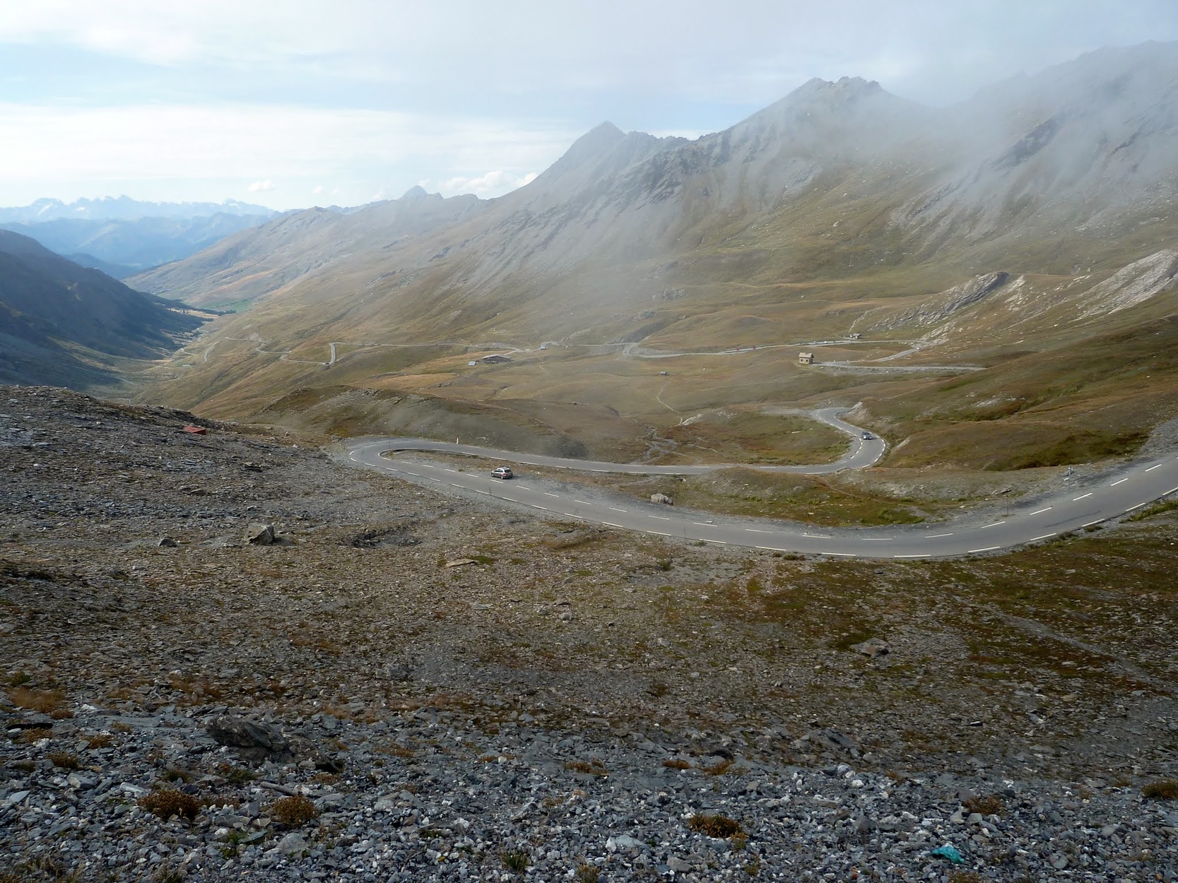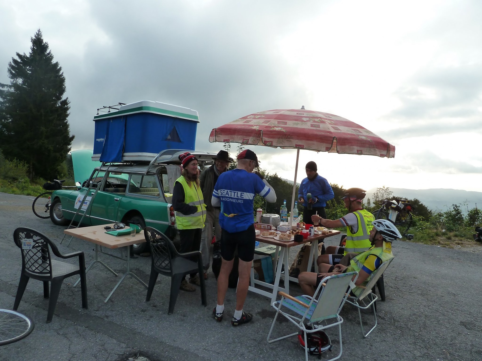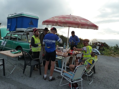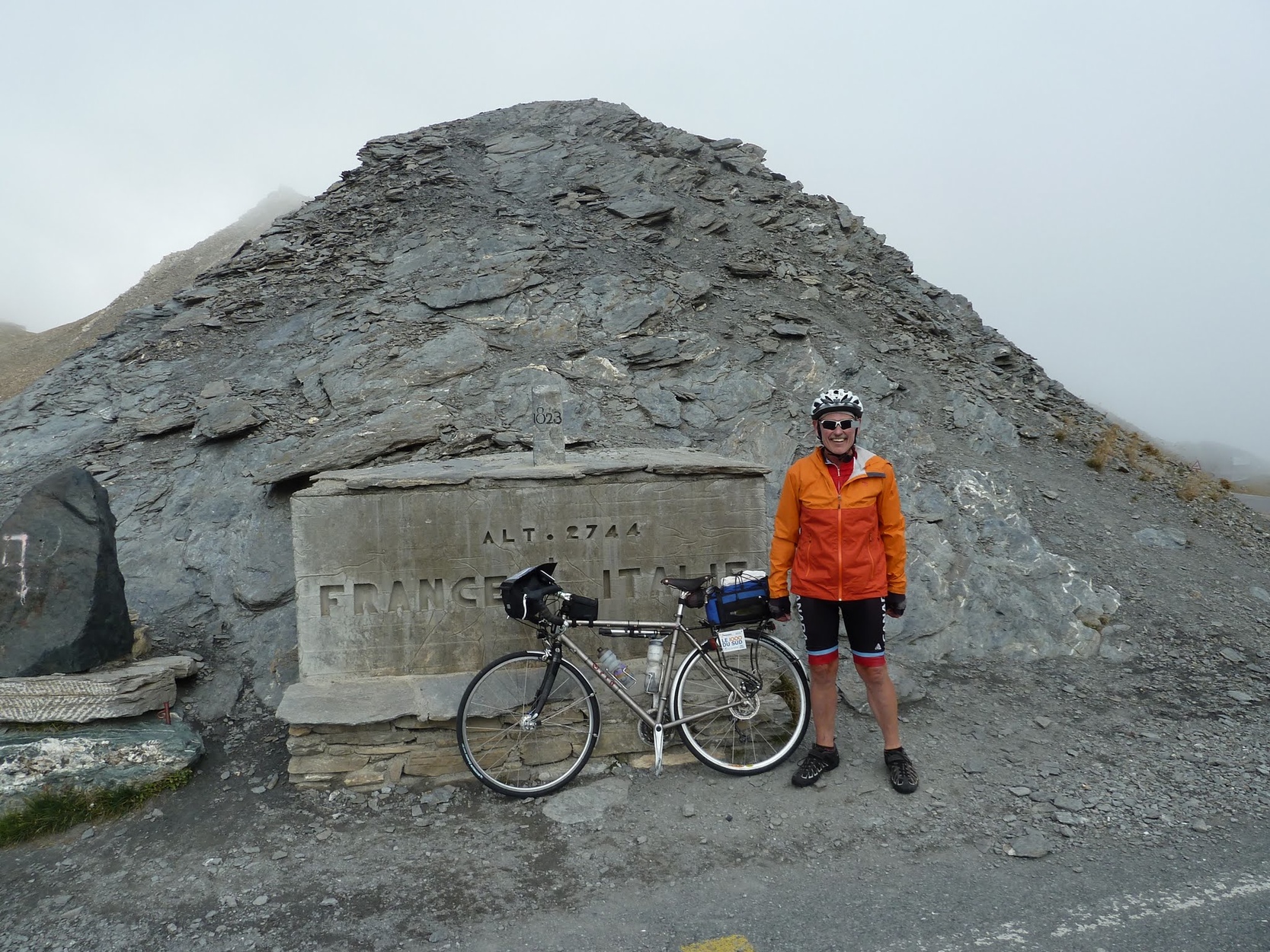 Day 2 Just think how much beer you could get in that! This started an all day long series of descents and climbs through the Ligurian Hills. These were all 300 to 500 plus meter climbs and usually featured grades of 8 to 10 percent. At the top of one hill later in the afternoon we encountered yet another secret control. The Provence Randonneurs certainly did put on a well supported ride for an event that was advertised as completely unsupported. The support at these controls was much appreciated though since much of the ride went through small villages with no stores. All those climbs began to take their toll on me. My legs were fading badly and I was having difficulty keeping up with Hugh. I began telling him that he should not worry about me and go on ahead at his own pace. At this point we were behind the clock by about an hour. Sophie makes it abundantly clear that intermediate control times will not be strictly enforced. She encourages everyone to carry on and try to finish the ride, and she promises to homologate anyone who finishes inside of the 75 hour time limit. And she runs the clock in a non standard way for this ride with the clock running at a mere 8 km hour for most of 100 km where the ride goes over the third highest pass in the Alps. Even with all that I was pretty sure that if I was an hour behind the clock at less than the half way point in the ride then I wasn't likely to have much chance of finishing the ride in time. A man has got to know his limitations. I thought that Hugh (who had already twice finished the 1000 du Sud in previous years) did have a chance though and I didn't want to be the anchor that caused him to fail. Eventually he must have agreed with me because he disappeared up a steep hill in the middle of the afternoon and I never saw him again until after the ride. In the end he finished the ride with something like 45 minutes to spare. By this point I knew most of the riders who were riding in my general vicinity. There was David from Britain who had vastly underestimated the difficulty of this ride. He had a plane reservation to get to on the evening before the ride finished. Ultimately he managed to reschedule. There was Alain and Doris from Bavaria riding steadily along. They were a bit slower than me but always around because they were so steady. They were obviously very experienced randonneurs. Then there was Boris. He was another German who had an American wife so he spoke excellent English. He was a very strong rider but was having trouble staying on the bike. I would pass him while he was napping. Then he would zoom past me. Then I would see him napping again. I had very similar issues at PBP where I took 11 naps in addition to 3 nights of sleep so I applauded him for making the wise decision to nap whenever necessary rather than risk falling asleep on the bike. Then there was Philippe the Frenchman. He was another strong rider who was probably strong enough to finish the ride had he been focused on doing so. But he wasn't; he loved to talk. There were many times when I passed him while he was off the bike chatting away to some person or another, in either French or English. He was probably the most unfocused randonneur I have ever met. He told me that his plan was to finish this ride and then tour back to his home in Brittany over the next 7 days. His home in Brittany was about 1800 km from Carces which makes for an average of about 250 km a day with full touring gear. All this after riding the most brutal 1000 km brevet imaginable. I wonder how that worked out. By evening I made the last descent from the Ligurian Hills and came out onto the Piedmont Plain. It was now time for a reality check. I had ridden 500 km with about 7800 meters of climbing in 37 hours with one hour of sleep. My leg muscles felt like bricks. I was riding slowly and walking all grades over about 8 percent. Next up was a 2500 meter climb where the last 9 km averages 10 percent and there are sections of 14 percent. I would need to ride this at night with no leg warmers in what was likely to be freezing temperatures at the top of the pass. The reality check seemed to indicate that there was not much chance of success. I knew my limitations. The next town that I came to was Narzole. Here there was a hotel that was open. I didn't know what was ahead in terms of towns that might have hotels but I did know that in France if you are going to get a room you had better do so by 9 pm. So I got a room. In fact, I got a fabulous room. It may have been the best room in the hotel. They gave it to me because summer was over, the place was not very full, and this was a ground floor room that had room for my bicycle. I showered and then put on my smelly cycling clothes (It's an unsupported ride. These were the only clothes I had). Then I had a 4 course meal in the hotels fancy dining room, followed by some grappa. Then I slept for 10 hours. Before sleeping I phoned Sophie to let her know that I was not going to finish the ride in time and to not expect me at any more secret controls. I did tell her that I intended to complete the ride but would surely arrive well past the cutoff time. Day 3 It was 4:15 pm when I finally reached the 2744 meter high pass. I was about 16 hours behind the clock at this point and was almost certainly not going to finish even in the same day as the end of the event. But it was a very cool place with stunning views into France. Italy was shrouded in mist. I took a few pictures and headed down. It was a superb descent that would have been scary as hell in the dark. And by this time the disk brake pads had worn to nothing on my rear wheel. I still had some little braking force there and the front was working well so I left the brake alone. I couldn't imagine doing this descent at race pace like Ryder Hesjedal did when he came third in a Tour de France stage a few years ago. ![]() The road to France The descent went on forever. At one point I went by a road junctio