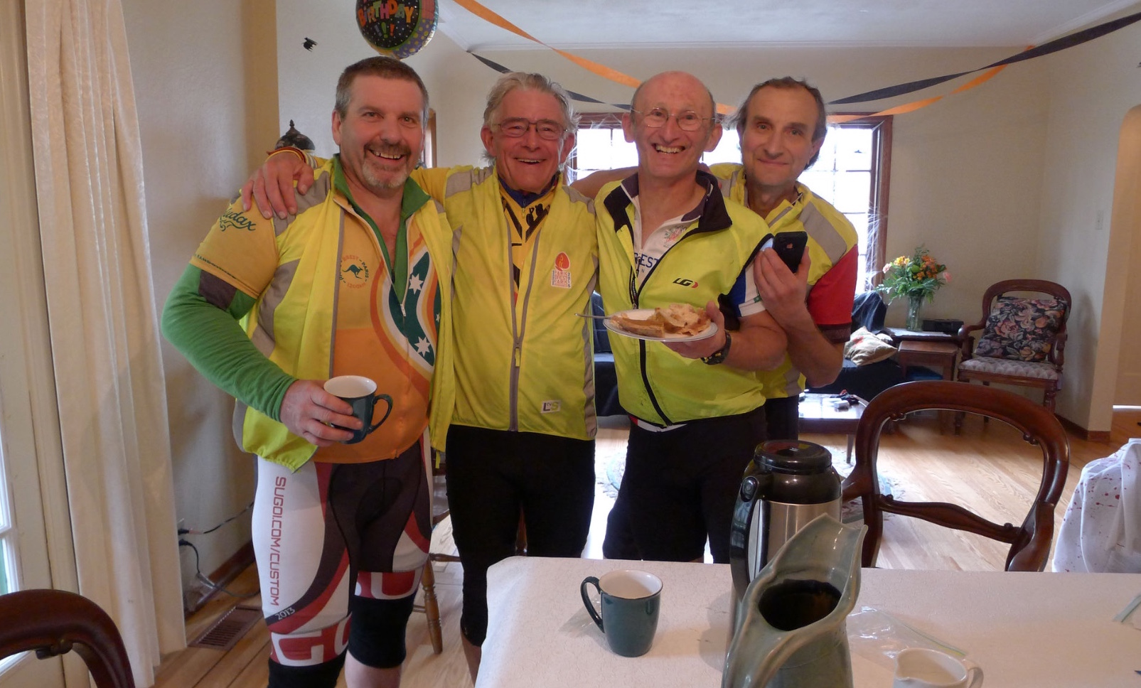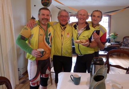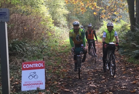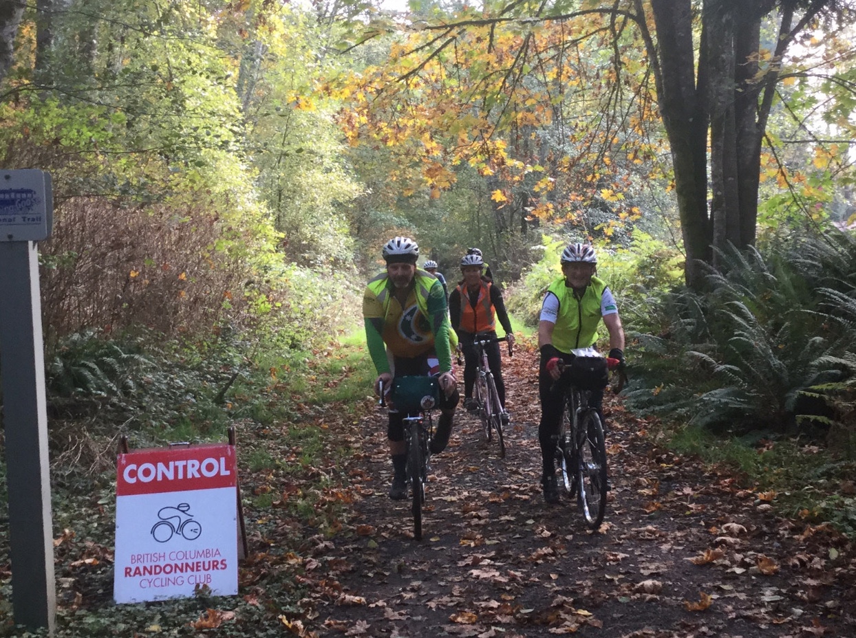 ![]() Secret Conrol near Sooke Photo: John & Sarah Fall IsleLander 200 Organizer's Report October 18th saw 20 riders leave Esquimalt and enjoy a ride north to Sidney, out west to Sooke, and back to Esquimalt. The day was cloudy and calm, and gorgeous autumn foliage welcomed the riders on both the Lochside and Goose trails. Robert Sexton came all the way from California to take part, as did several of our mainland members; the finale back at the Halloween-decorated house made for a very festive time. We heard stories of a wipe-out by David White on the Goose Trail, with a bloody arm photo to prove it; extreme extra kilometres by Joshua Hazelblower, who started at 7:45, but persevered to finish in good spirits as he carried the Lanterne Rouge; Deirdre Arscott and Mark Ford being motivated by the vision of pie at the finish; and Ken Bonner finishing the last several kilometres with only one foot clipped in as the other cleat was toast. As the host, I simply enjoyed the camaraderie of everyone. For having finished a very difficult 200 km that included a lot of climbing, there was a lot of laughter and story-telling at the finish. Thank you for the brilliant route revisions by the talented Stephen Hinde and Dave Macmurchie, that now include the E & N Rail Trail in the last leg of the ride. Everyone loved this addition, though we did hear a few murmurs about cues, and extra kilometres. I will contact CRD/Victoria/Highways, to try and get some nice signage on the trail, as it is impossible to describe on a cue sheet how to "look for a pedestrian crosswalk to the right of massive bush, but kind of hidden, and to make your way just to the right of the overpass, but not quite under it, and then find the trail pick-up, once you've you've bumped up and over one lane of highway, an island, 2 lanes of highway, and another 10 feet of sidewalk." @all rights reserved. Congratulations to Stephen Hinde that reached his 40,000 km mark, with the 200k volunteer pre-ride the week previous. Thank you to both Stephen and Dave Macmurchie that worked so hard on getting the new route refined. Thanks also to checkpoint volunteers Dan DeFeu, Rob Scrimgeour, Holland Gidney, Brynne Croy, Sarah Gallizin and John Little. Because of your efforts, all the riders felt supported, and had a fun time. Thank you also to Kemp Lake Store that received our riders. Please put this ride in your books for next year. ![]() Finishers enjoying the organizer's fresh homemade pie Will, Ken, Graham & Michael Photo: Lorraine