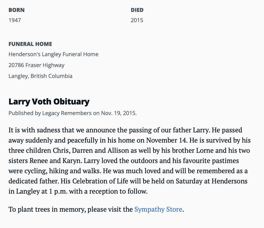 Go to: Larry Voth Randonneur Photos 2002-2015 Go to: Larry Voth Memorial Service (Details) Go to: Larry Voth Obituary and Condolences (Legacy) Go to: Larry Voth Obituary (Archived - jpg) November 15, 2015 |