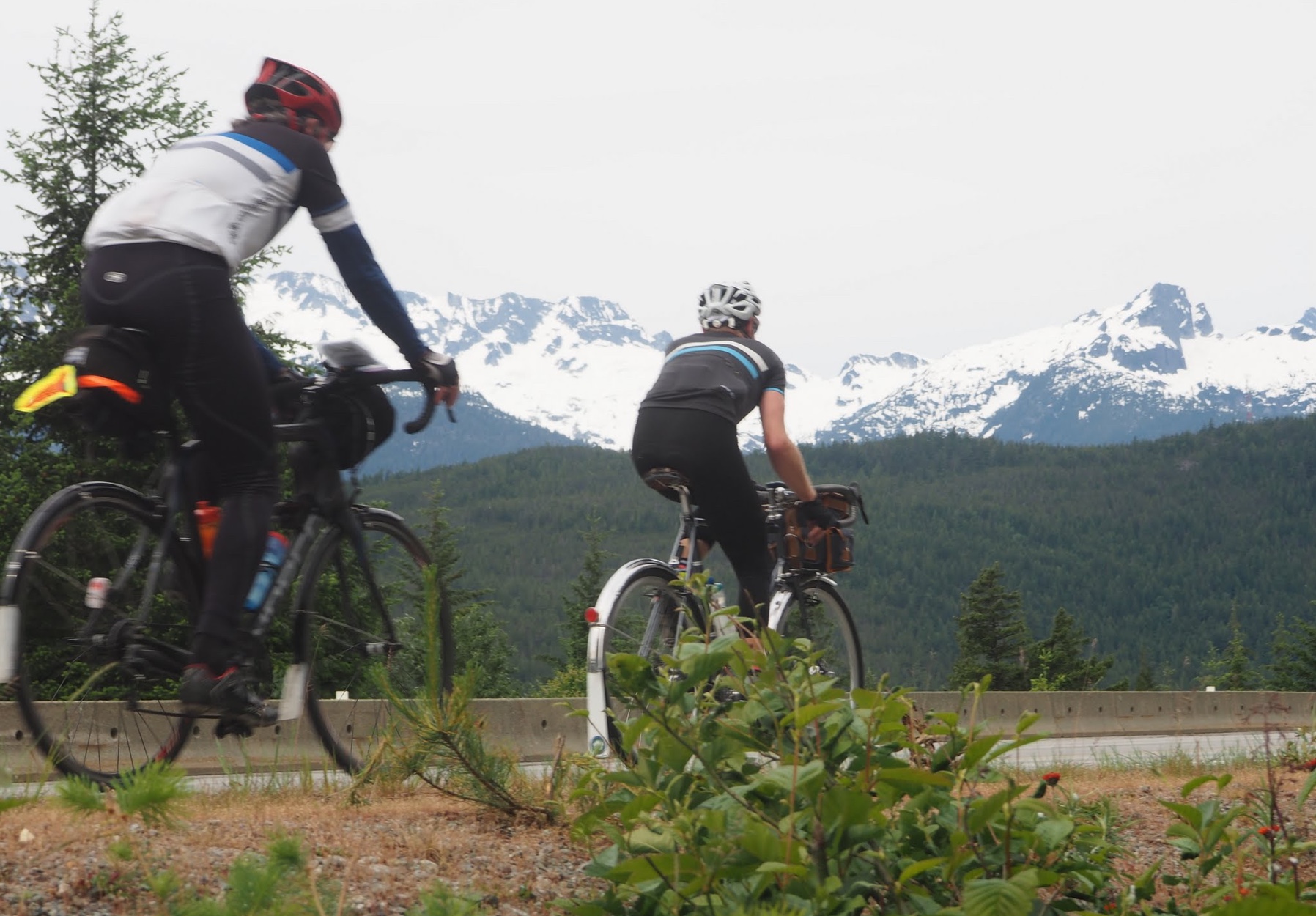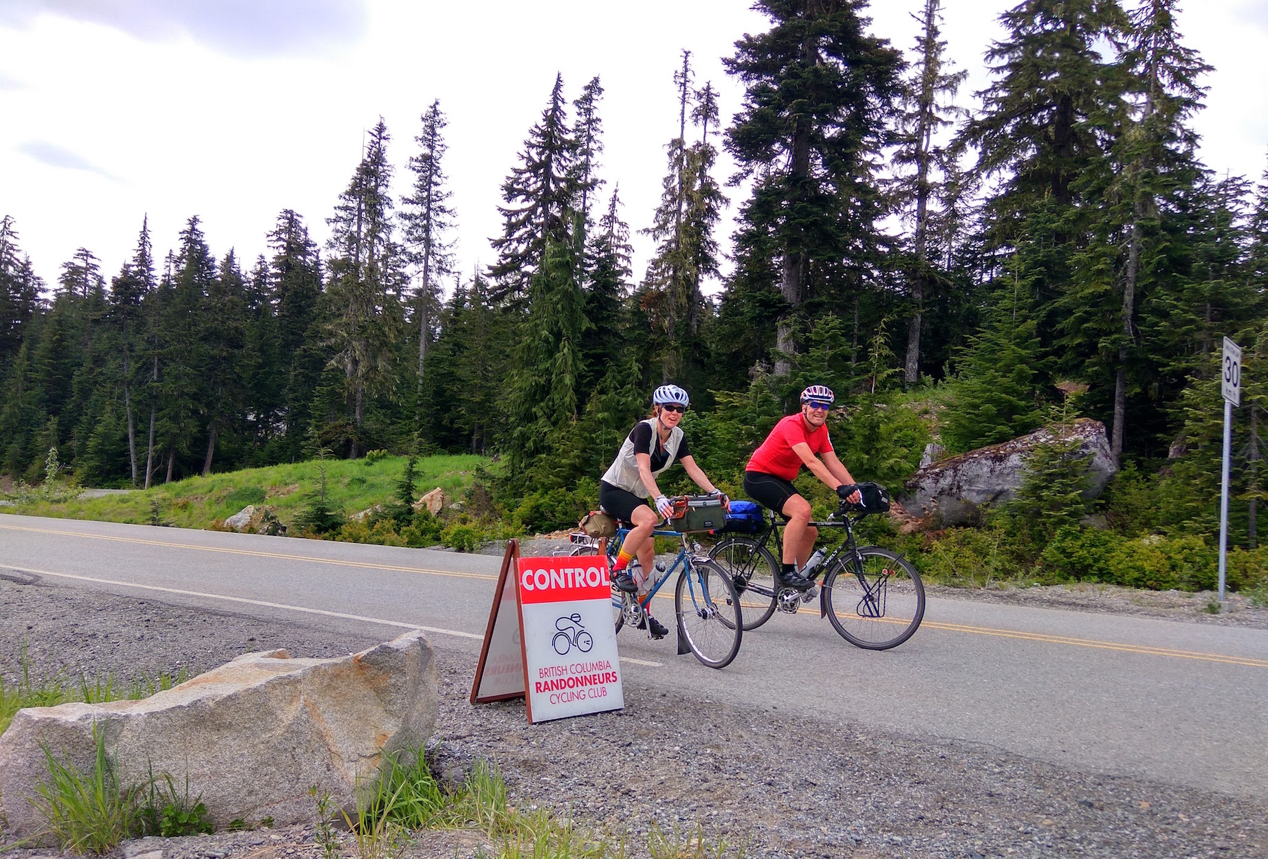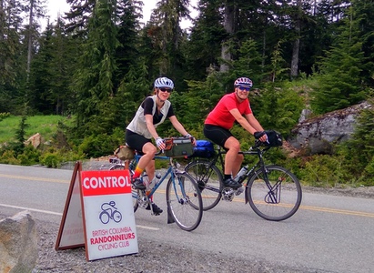 ![]() Chris Cullum and Peter Stary on the Sea to Sky Highway Photo: Bob Koen The Ups and Downs of the Spring 400 22 riders assembled at the familiar parking lot in Vancouver for the 6am start that would take them north to the Pemberton Valley. The weather did indeed look promising for the event, with only a smattering of rain for the later finishers to deal with. Bob Koen got some great pictures as we drove up the Sea to Sky, both on the 99 & Callaghan Valley Rd. Paul van Wersch managed to get his controle set up at the top of the WOP climb, the gate was unlocked at about 10am, it was worth the extra effort to sample his fine, home baked Paris B's most riders thought. We set up a road side bbq, as Bob told a motorist passerby, at the turn around point on Pemberton Meadows Rd that seemed to be well received by the field for them to eat, rest, & re-hydrate for the return journey to Vancouver. There was one abandonment, Francis Hopcraft had called me around 9pm from a sushi place in Whistler on his return. After a nice meal he decided to skip the lumpy bumpy cycle back to Vancouver. He was in good spirits and I look fwd to hearing his story about his ride. A well done for Jodi Caddick on completion of her first 400. All in all it was a tough brevet. On behalf of Dave K and myself congrats to the starters, I'll have to ride this one as a permanent to experience it. ![]() Jodi Caddick and Maciej Szarecki at the route high point - Whister Olympic Park control Photo: Paul Van Wersch